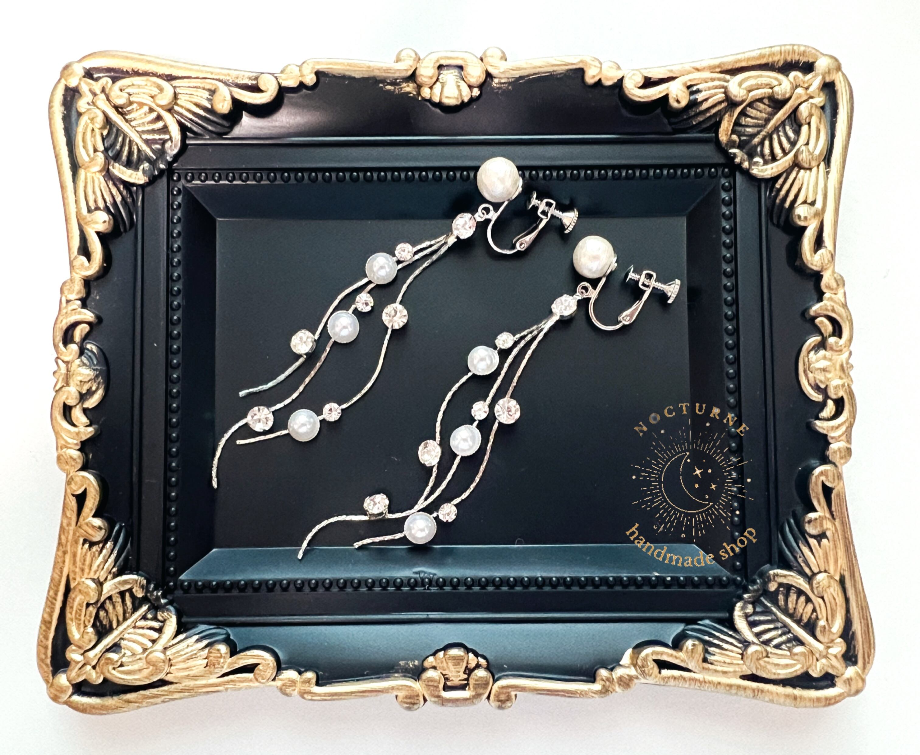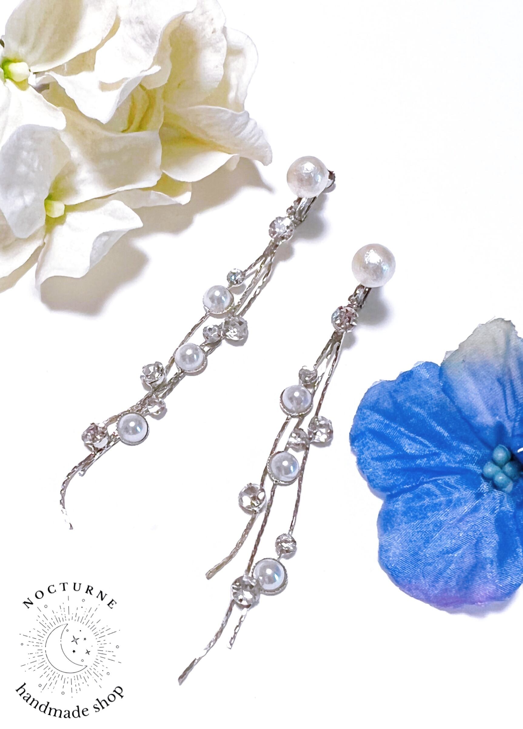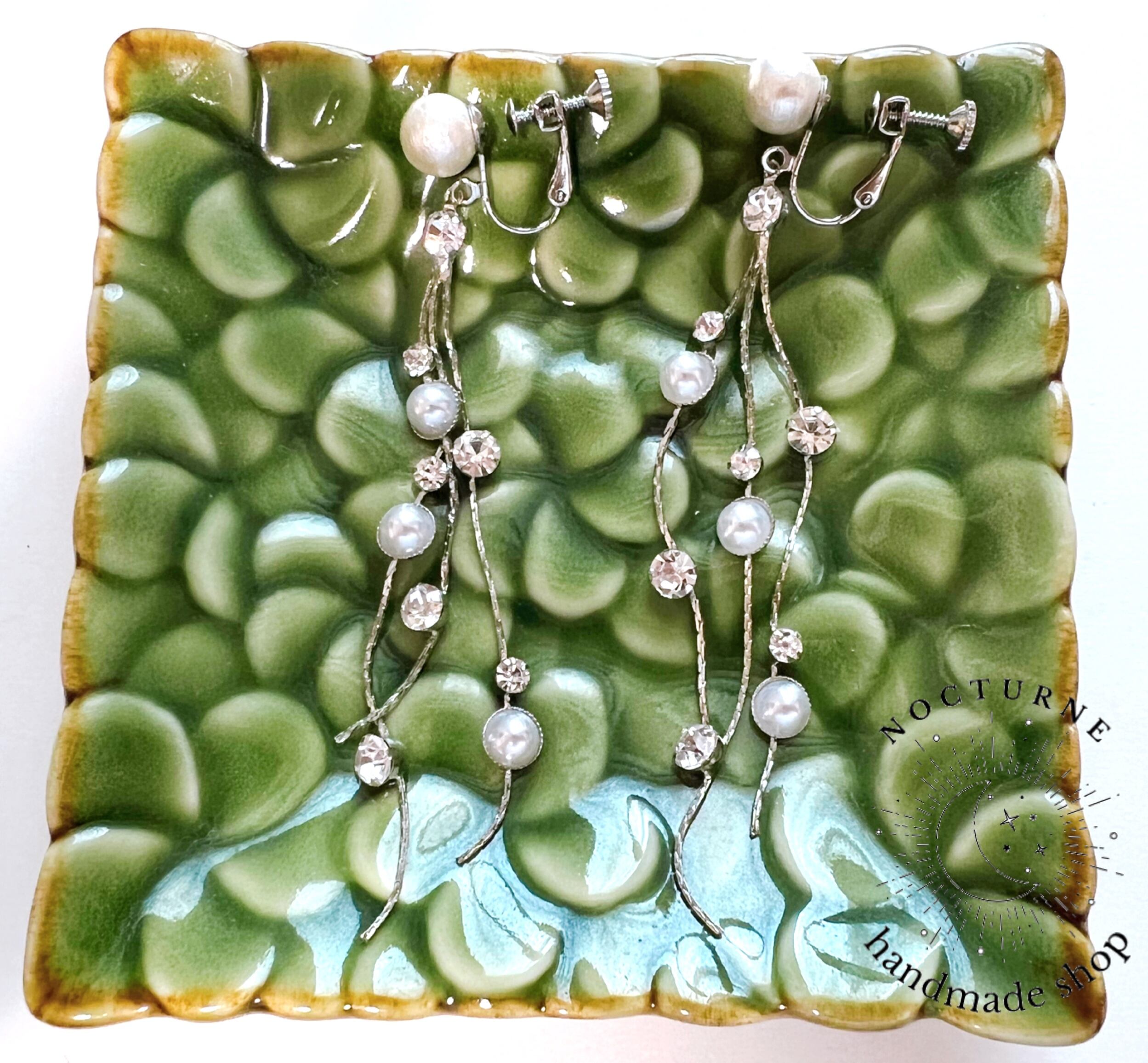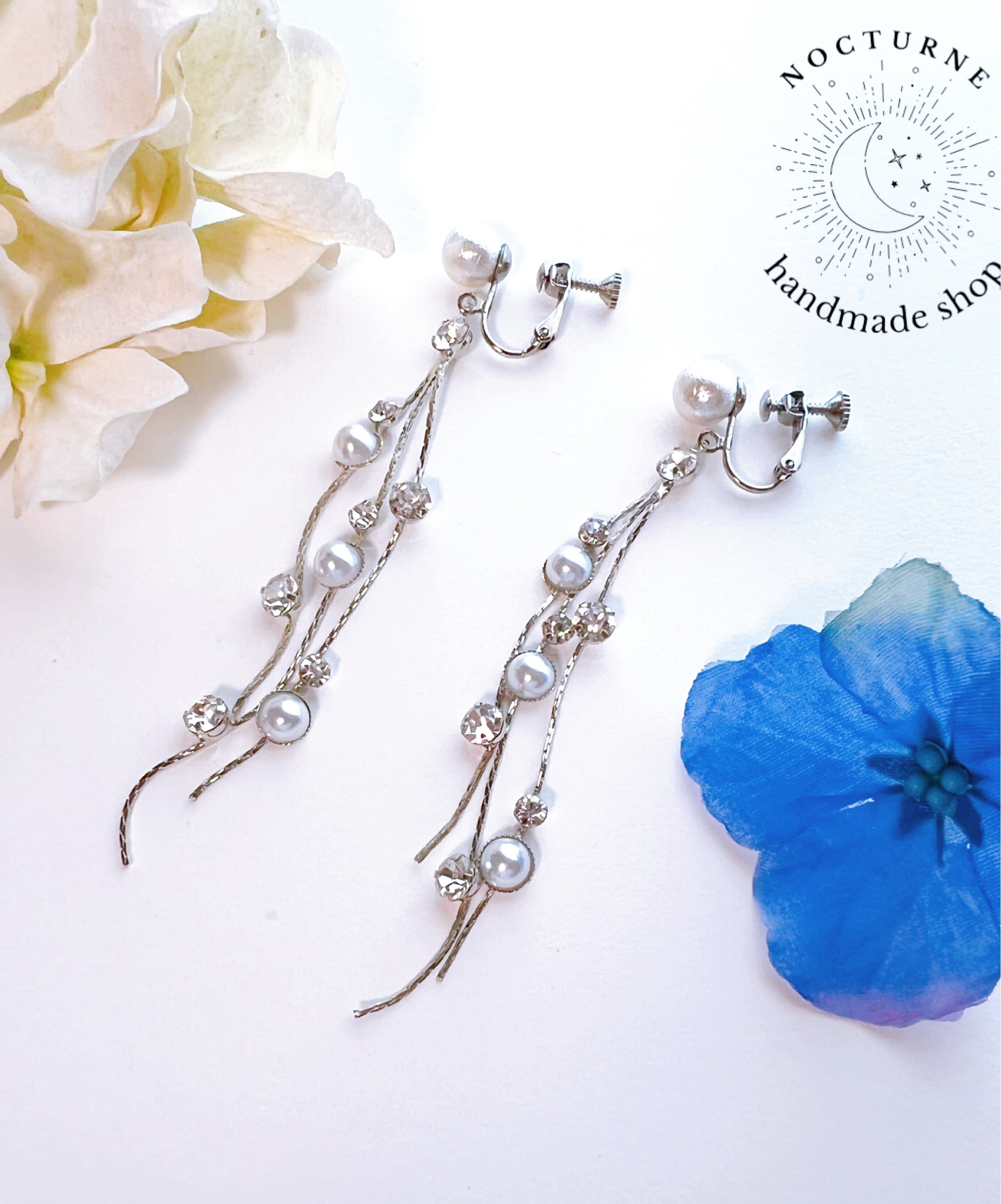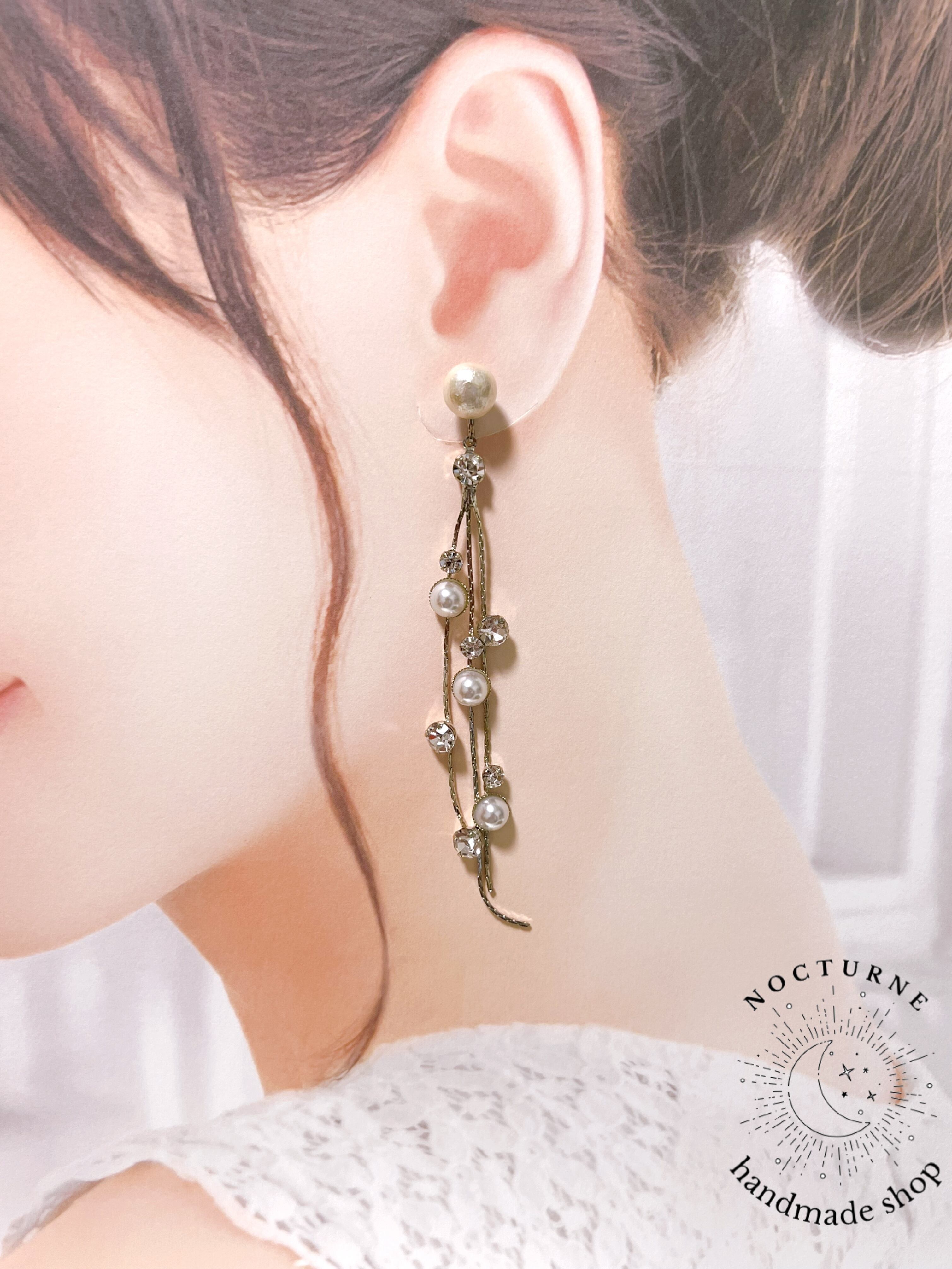 パールとクリスタルが散りばめられたシルバーチェーンをイヤリングにしました。