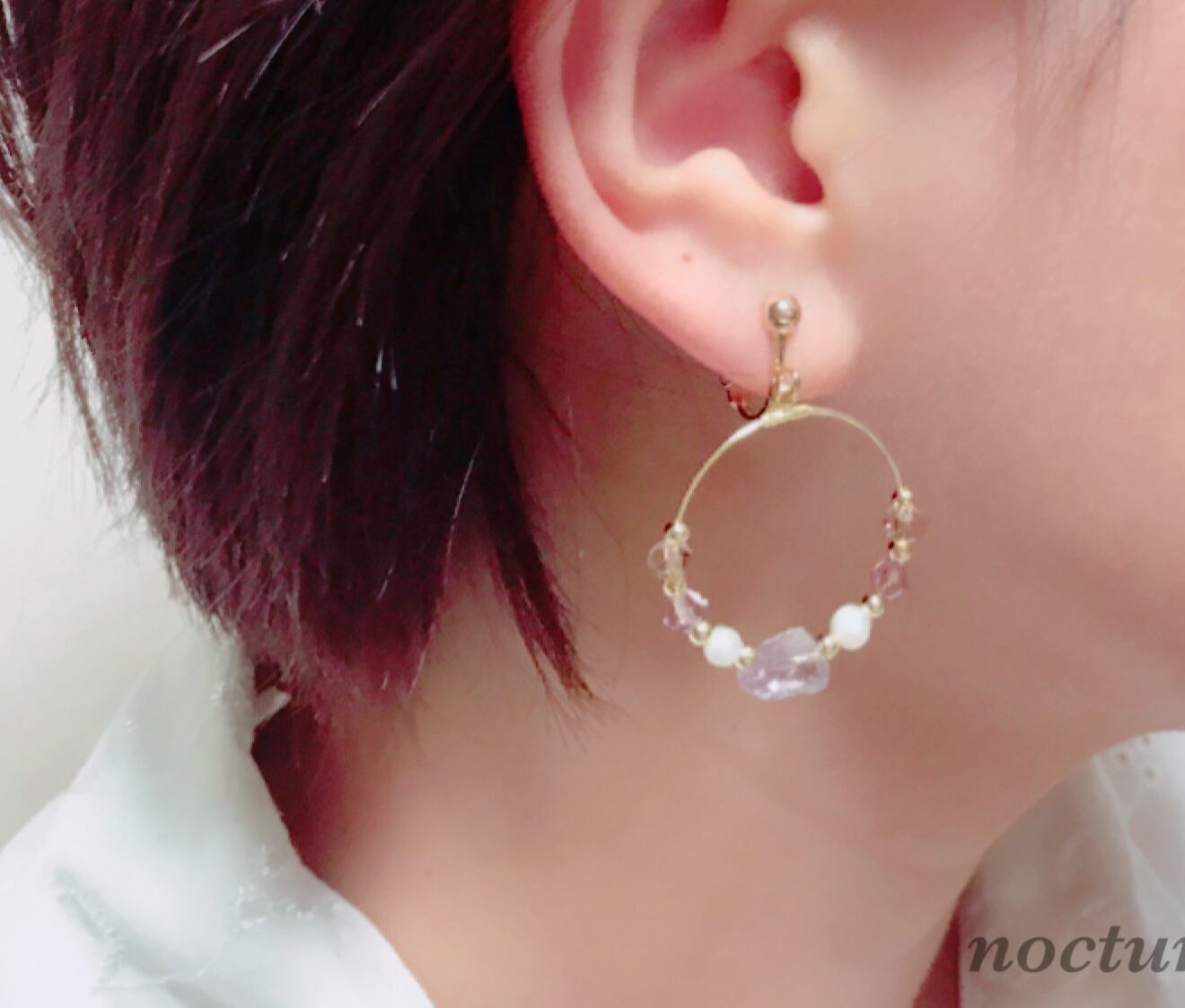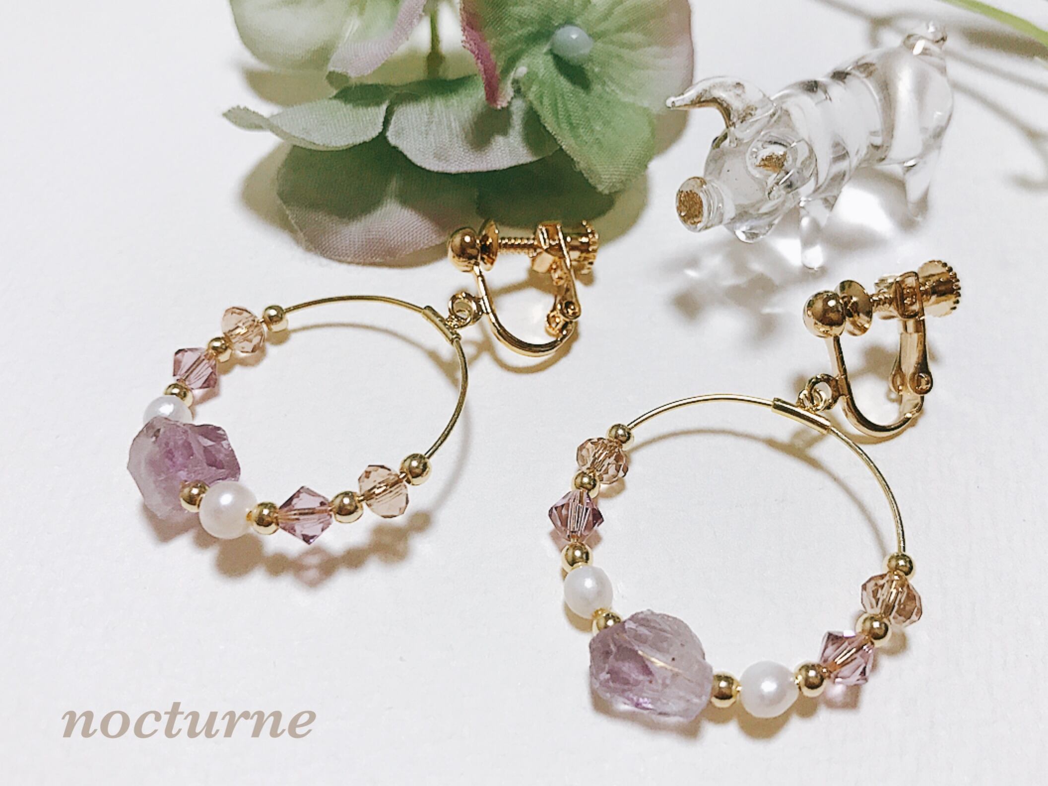 material:イヤリング(バネ式ゴールドメッキ)、フープ(2.5㎝ゴールドメッキ)、半貴石ラフカットアメジスト(5×9mm)、淡水パール(4mm)、スワロフスキー(ライトアメジスト4mm)、ゴールドビーズ