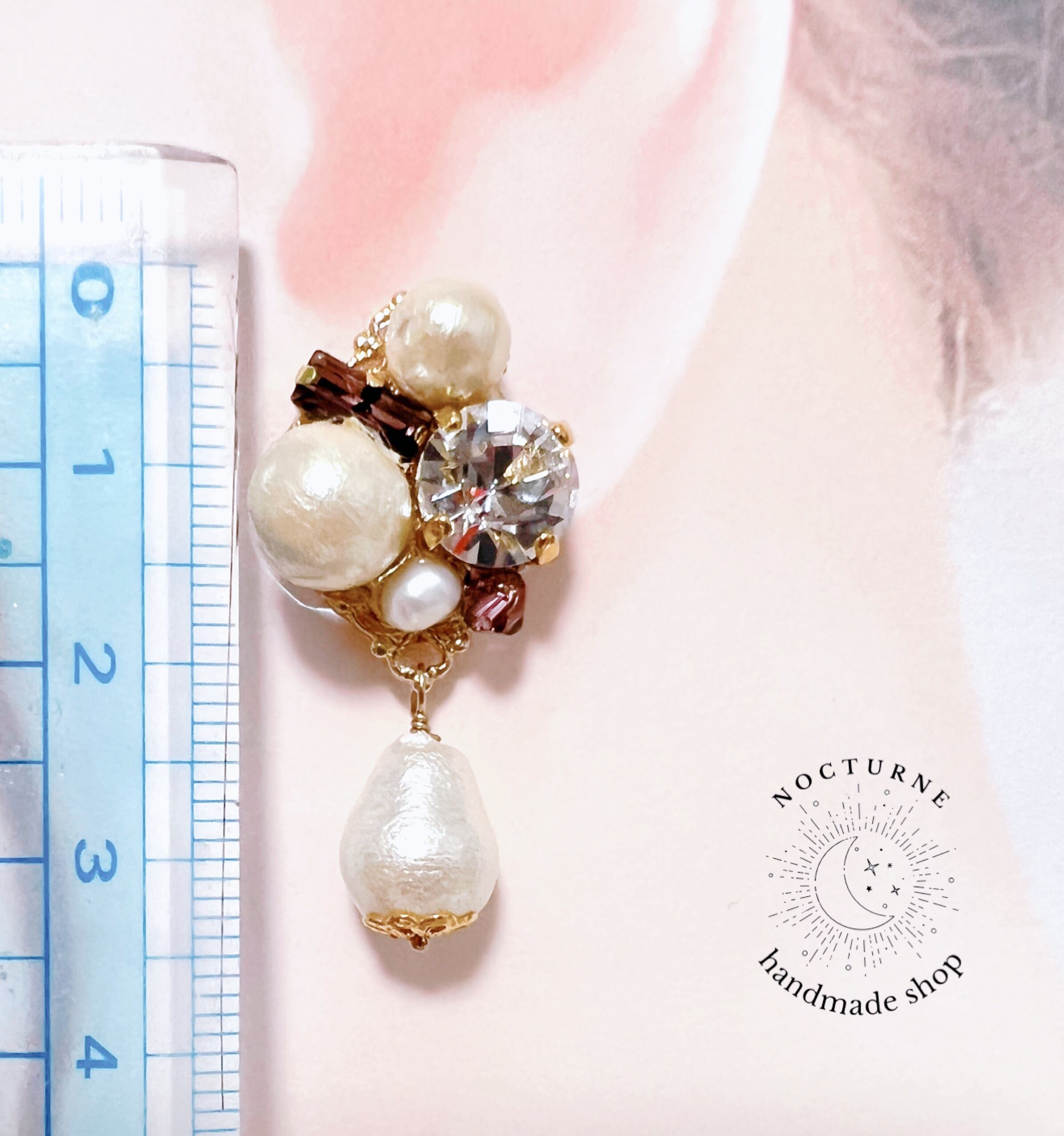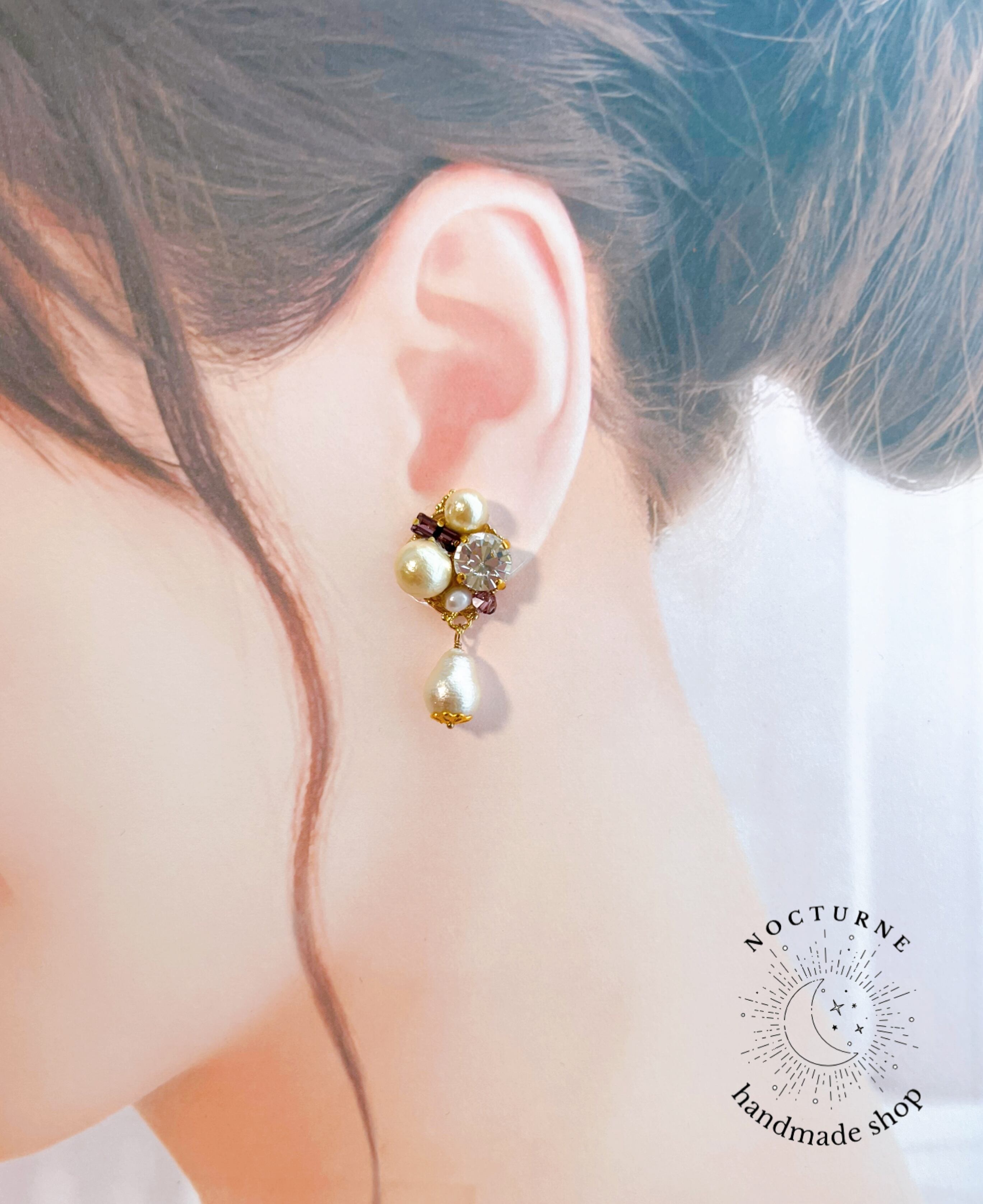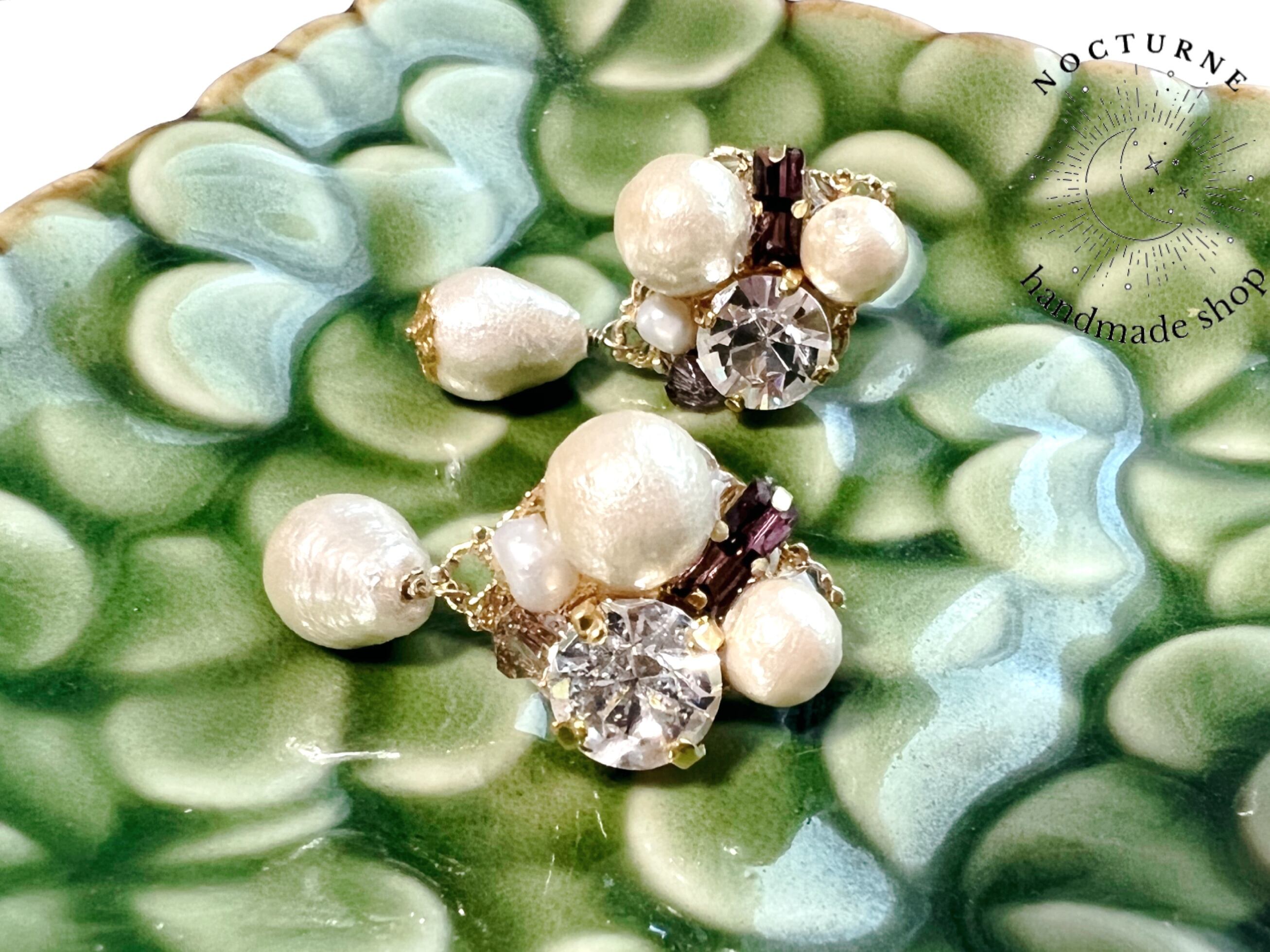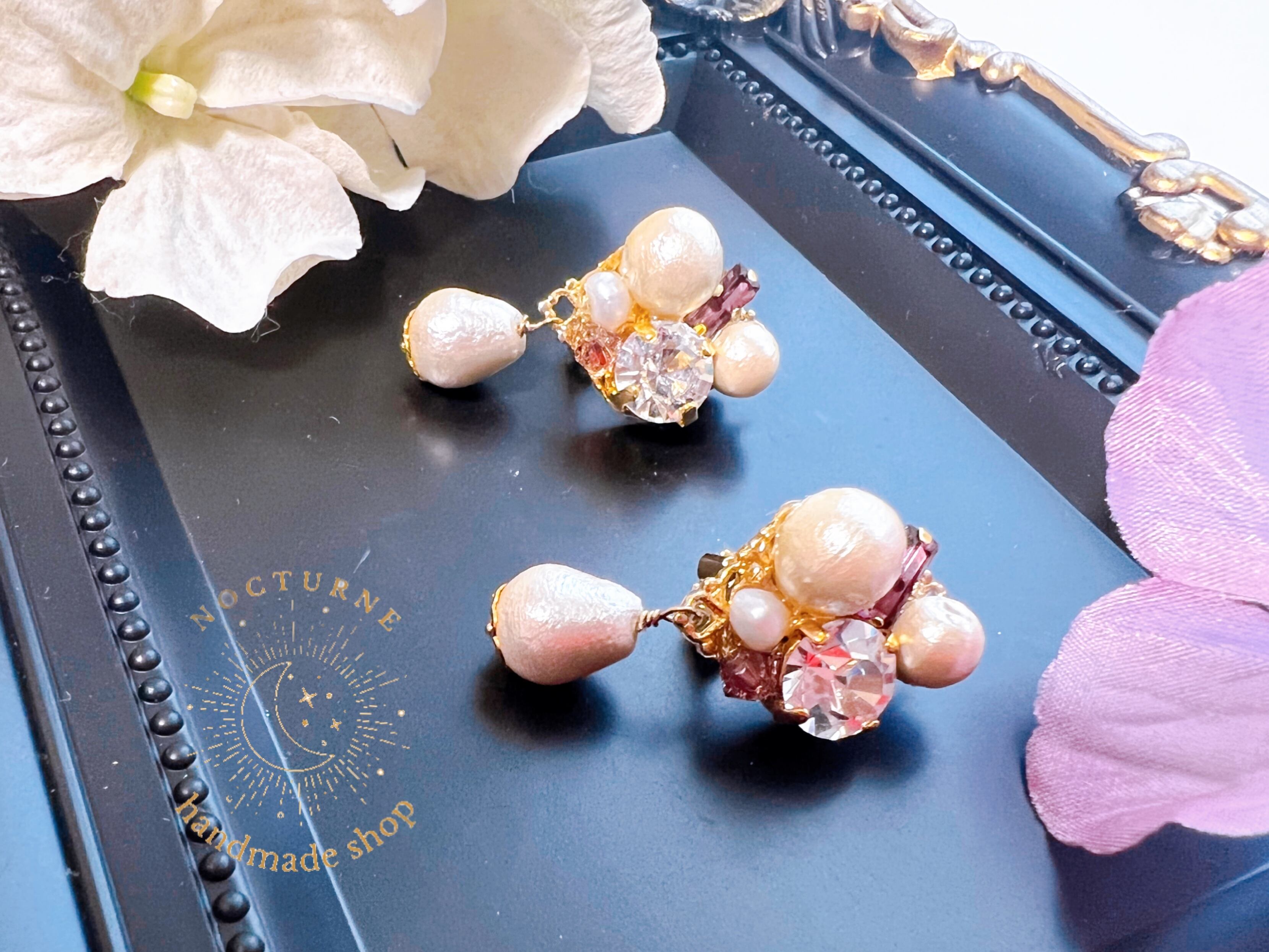 コットンパールとスワロフスキーのビジューイヤリング