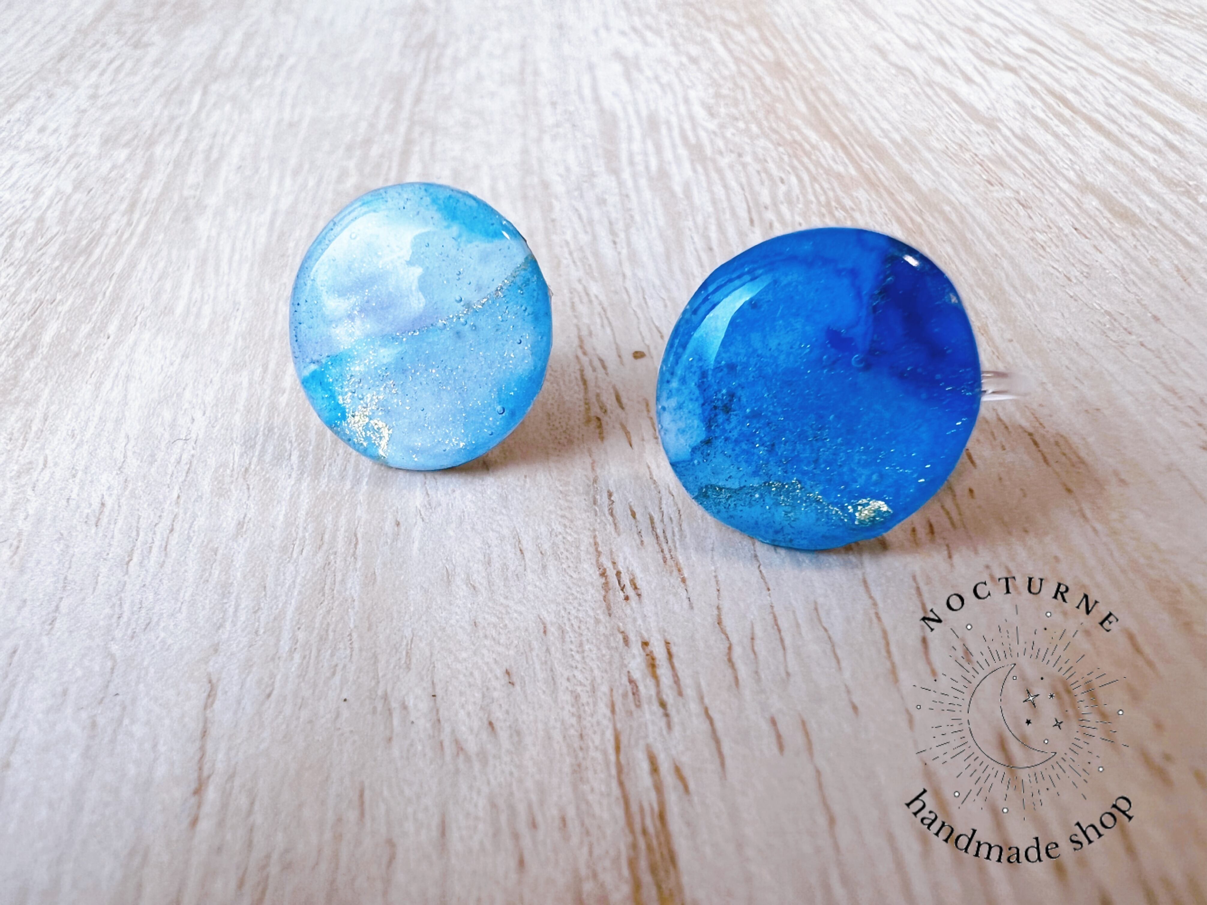 アルコールインクアートで描いた絵を星と月型に切り抜き、レジンでふっくらと仕上げた可愛いピアスにしました。