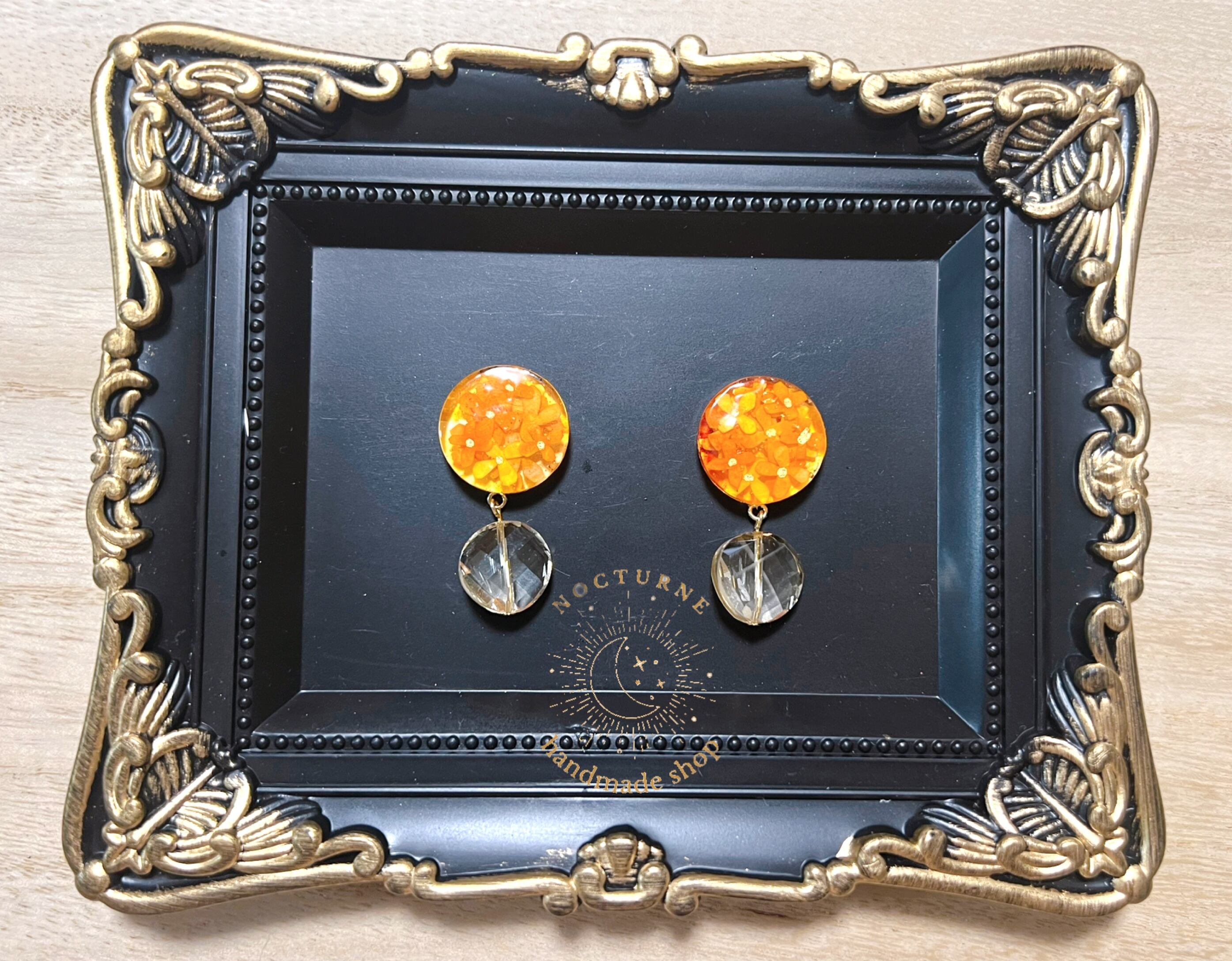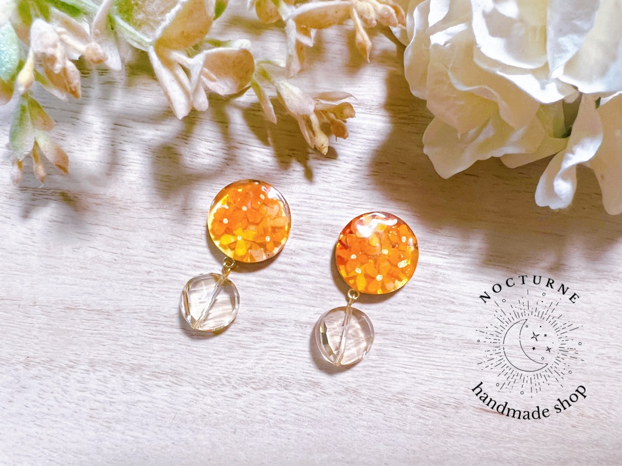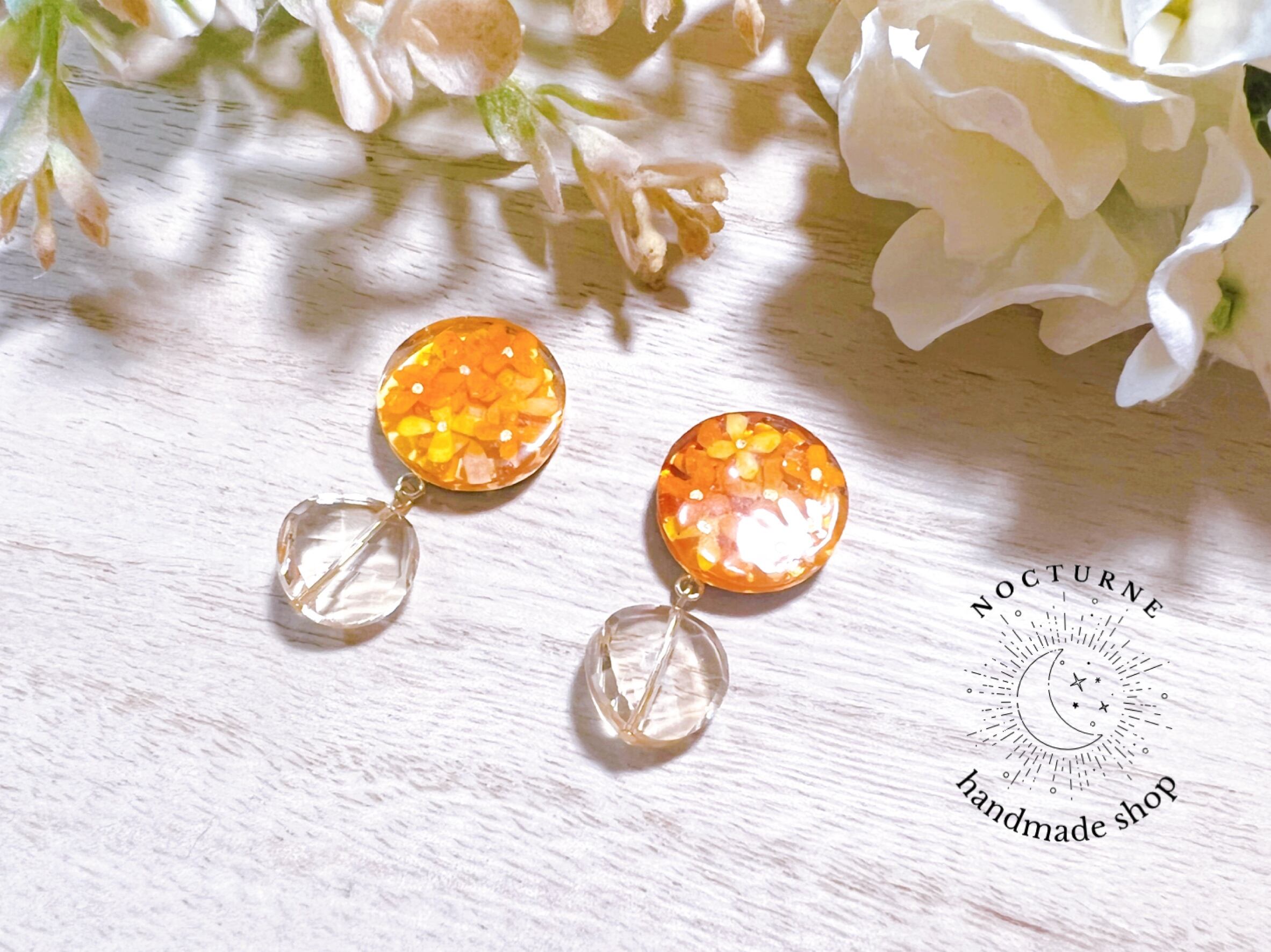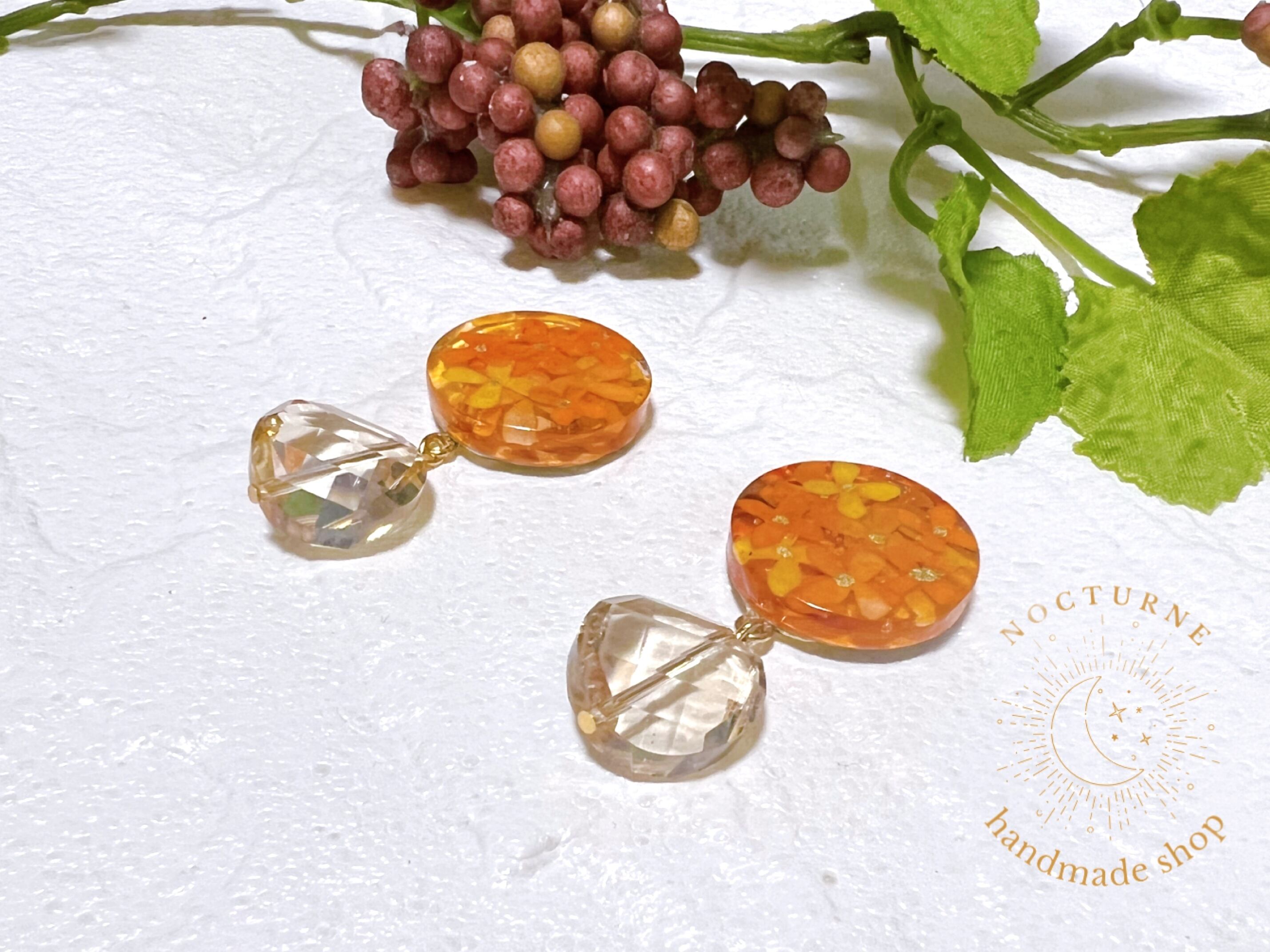 金木犀がぎゅっと詰まったレジンに柔らかいオレンジ色のカットガラスを下げたピアスです。