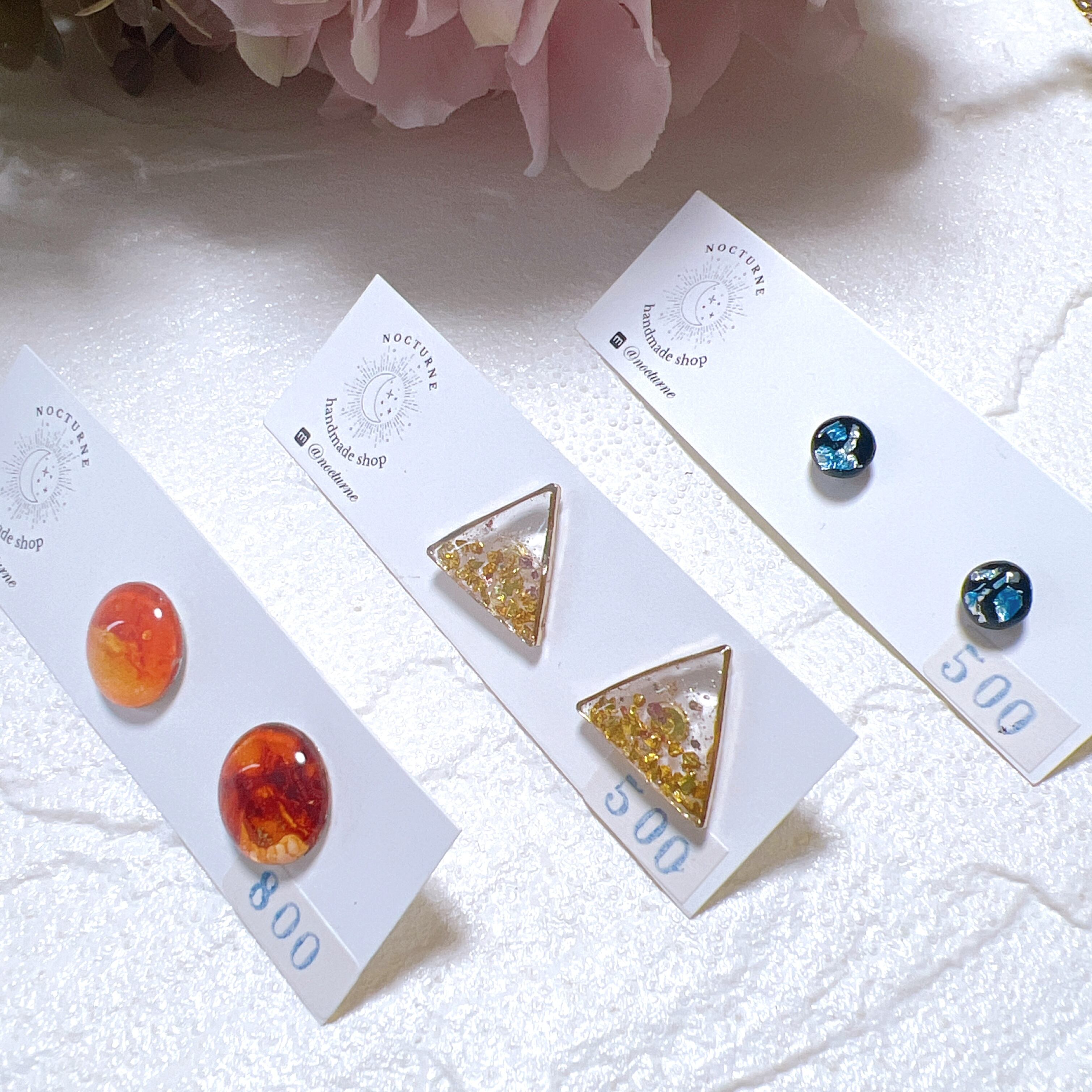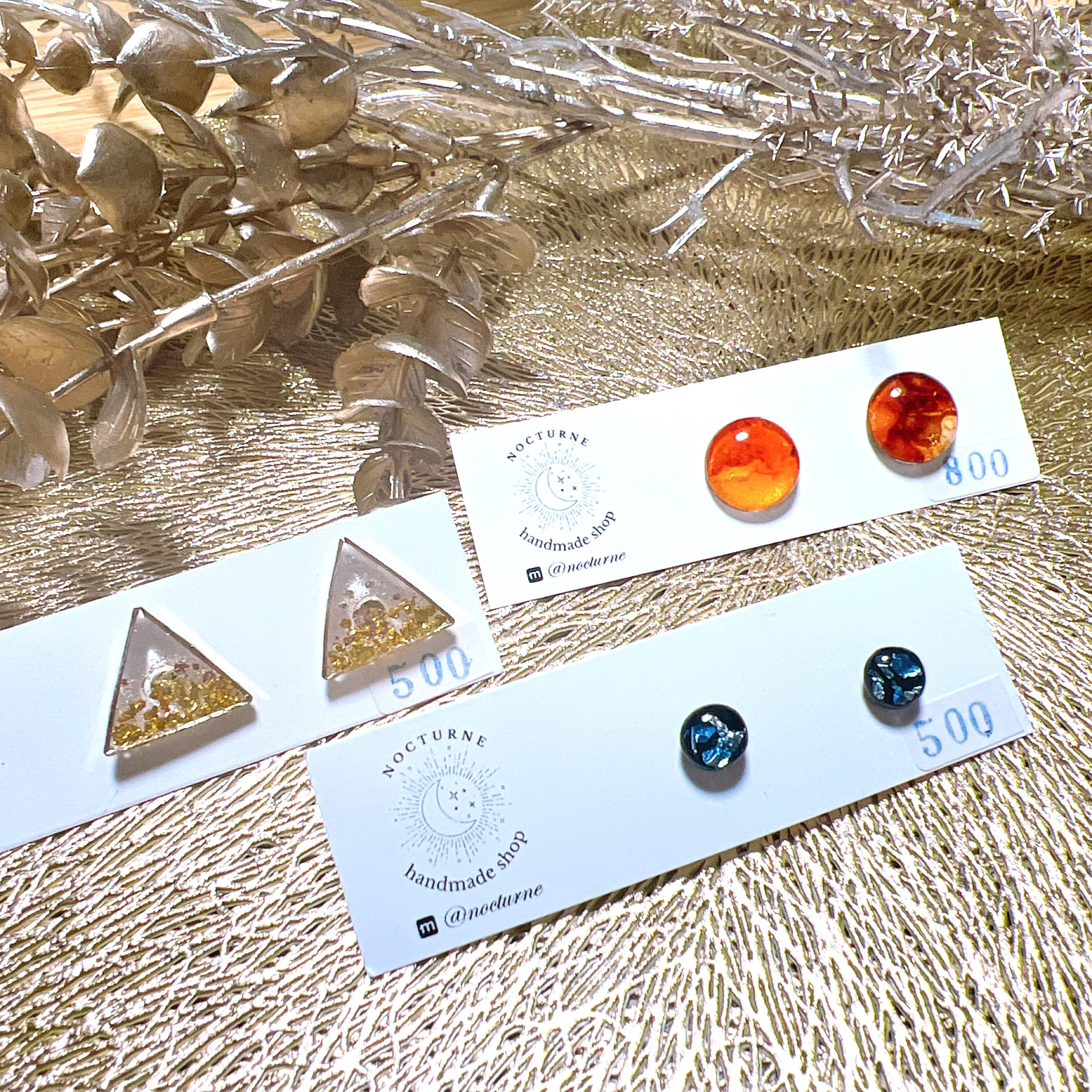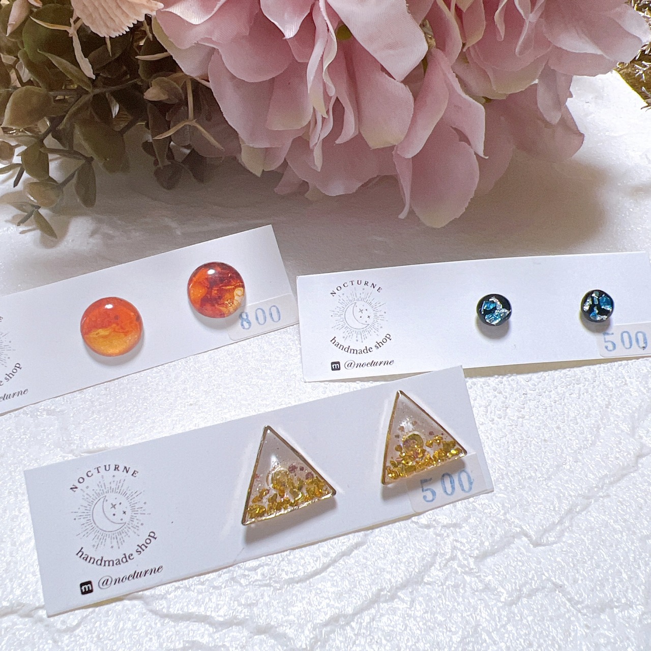 アルコールインクアートの鮮やかなオレンジ色のピアス、ホタルガラス風レジンピアス、ゴールドの三角ピアスの3点です。