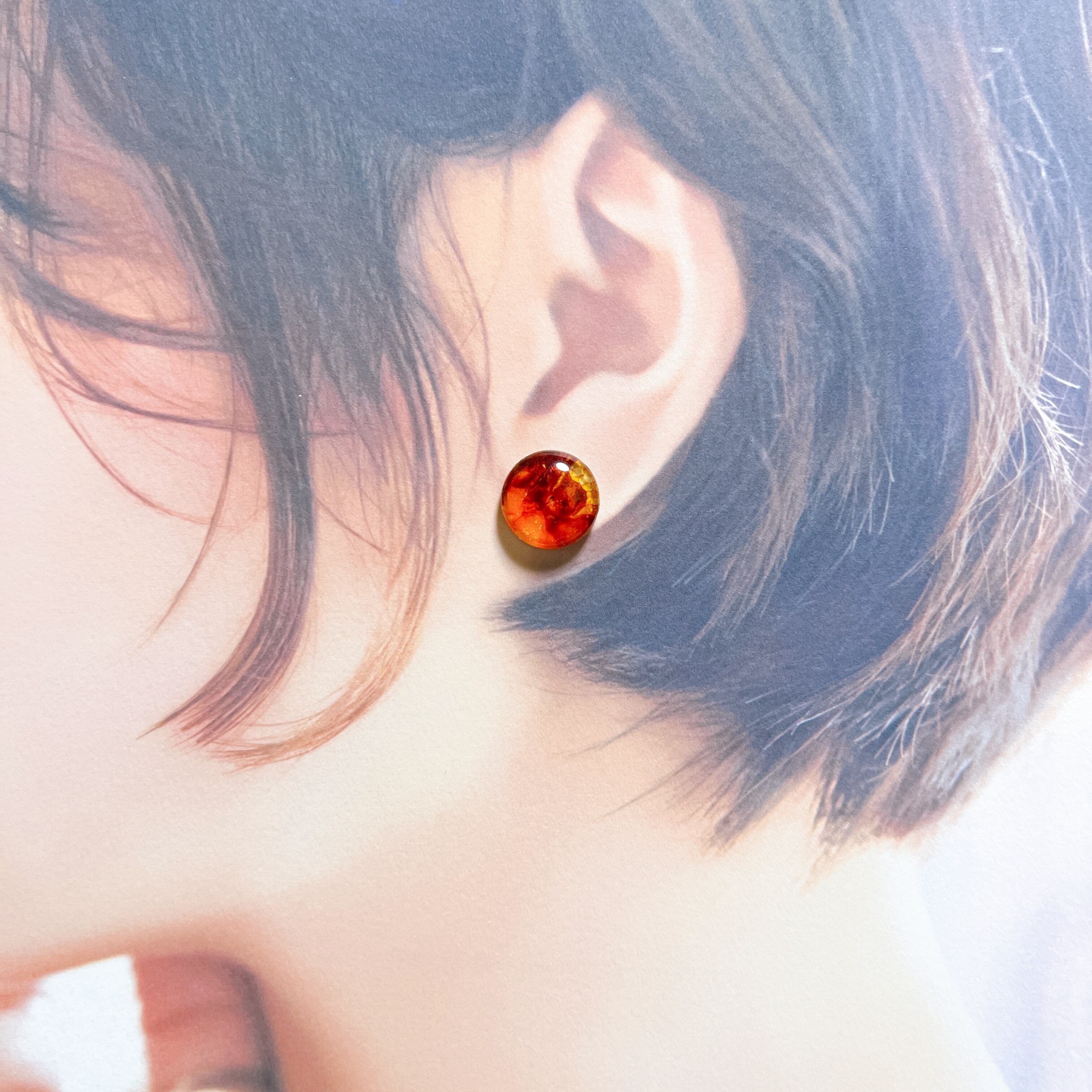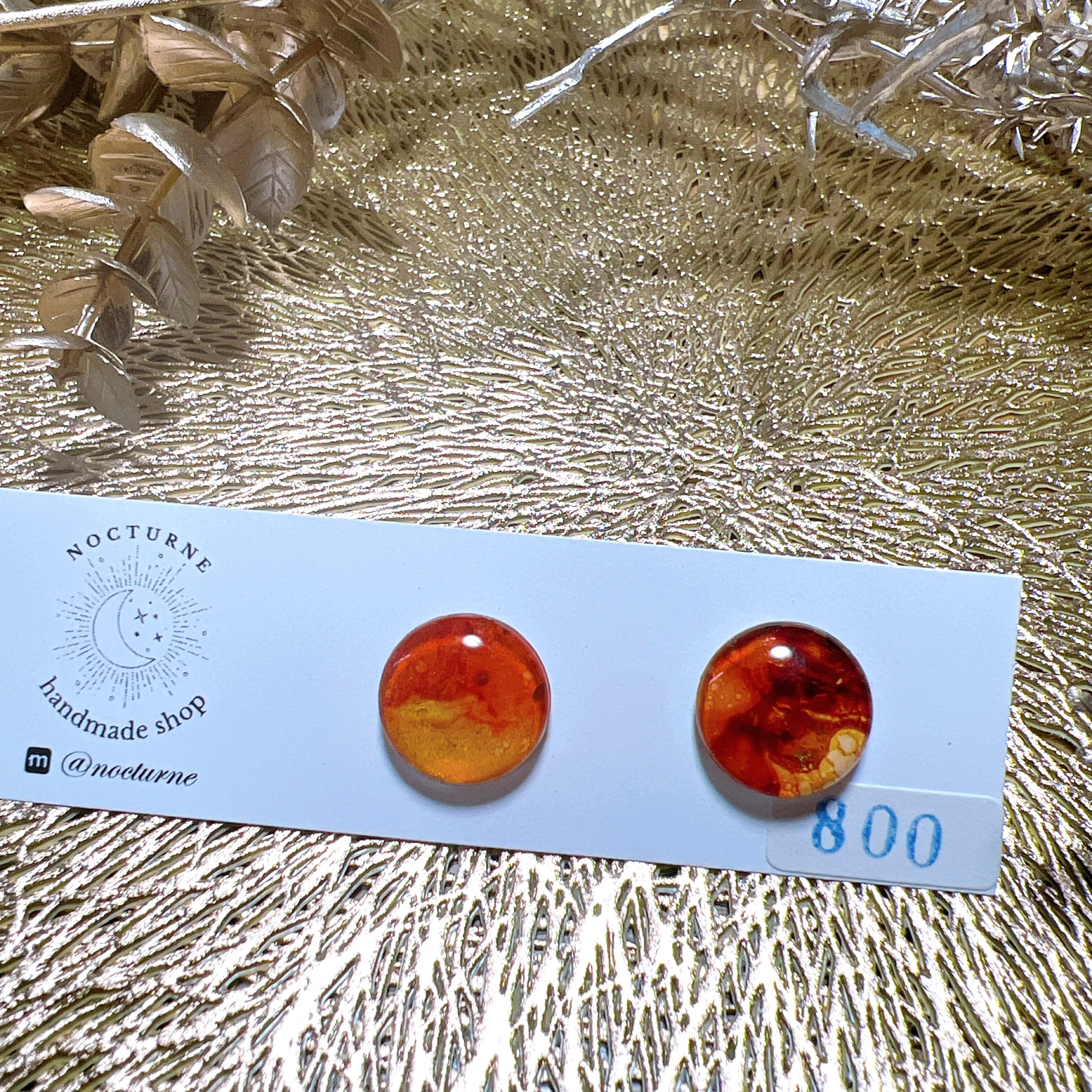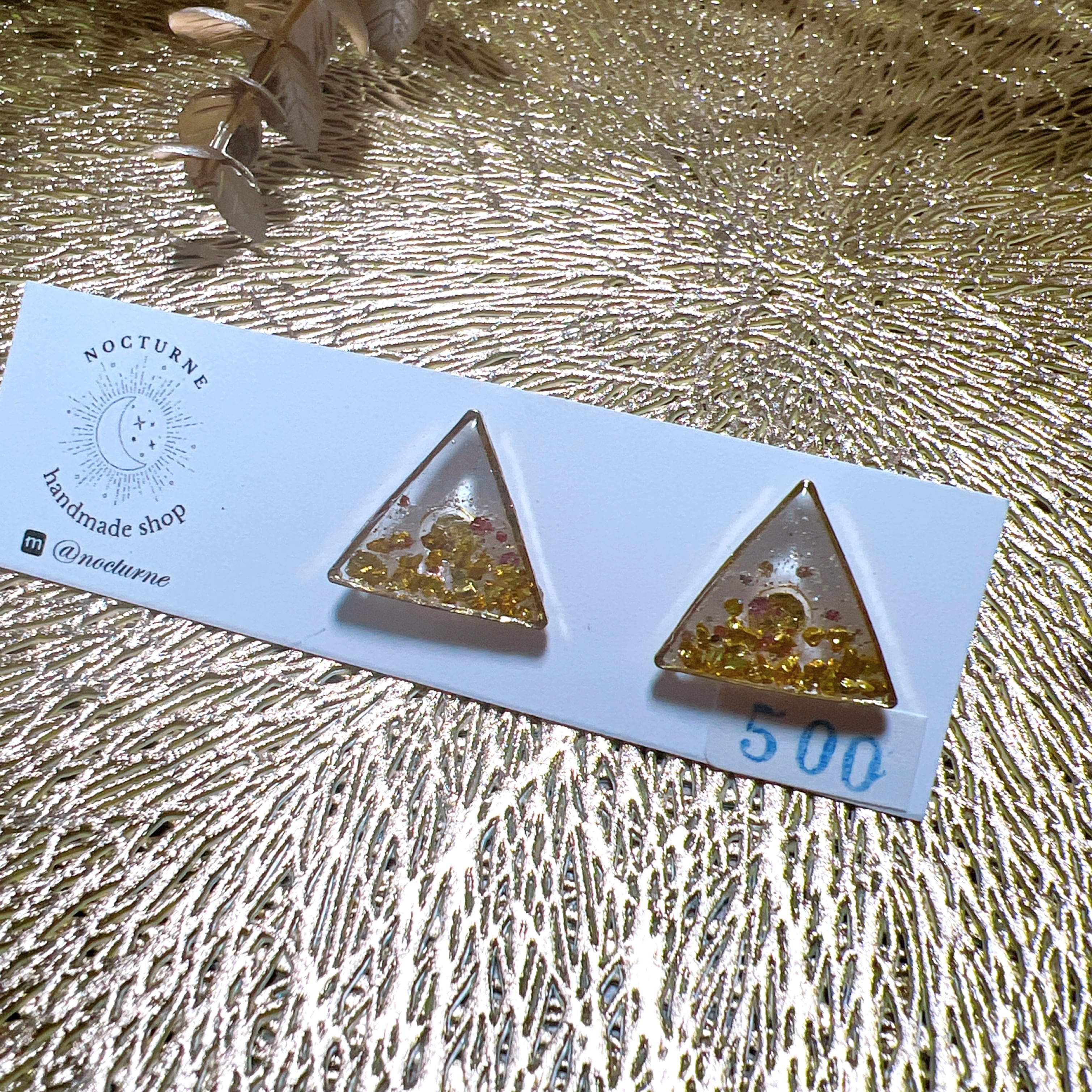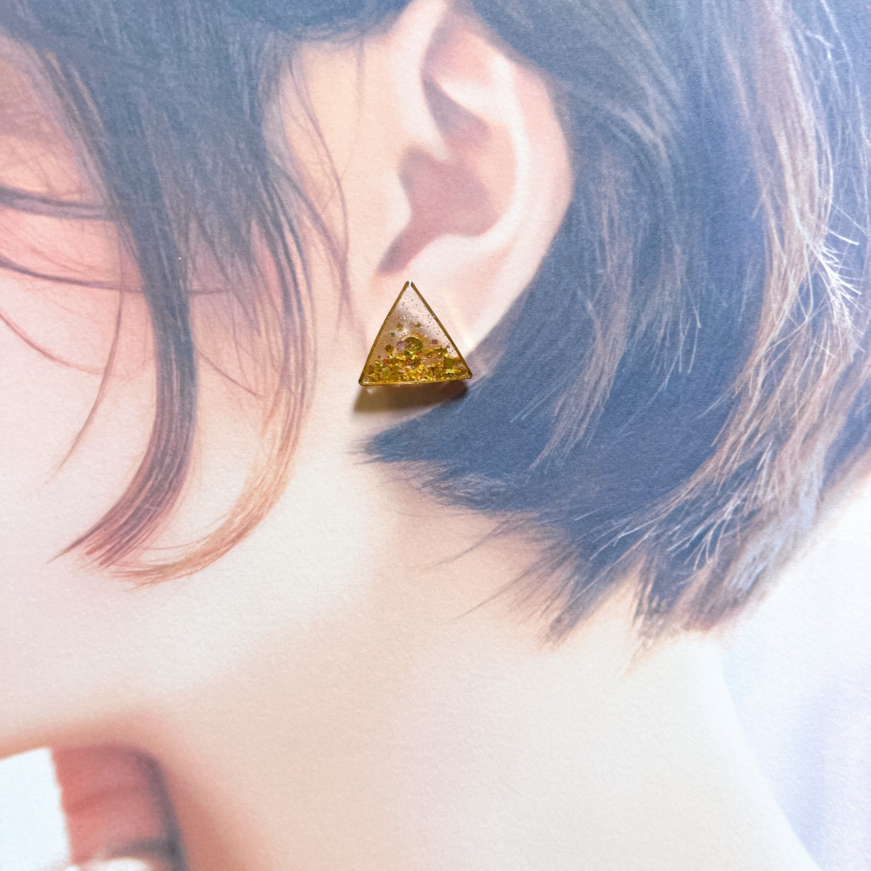 アルコールインクアートの鮮やかなオレンジ色のピアス、ホタルガラス風レジンピアス、ゴールドの三角ピアスの3点です。