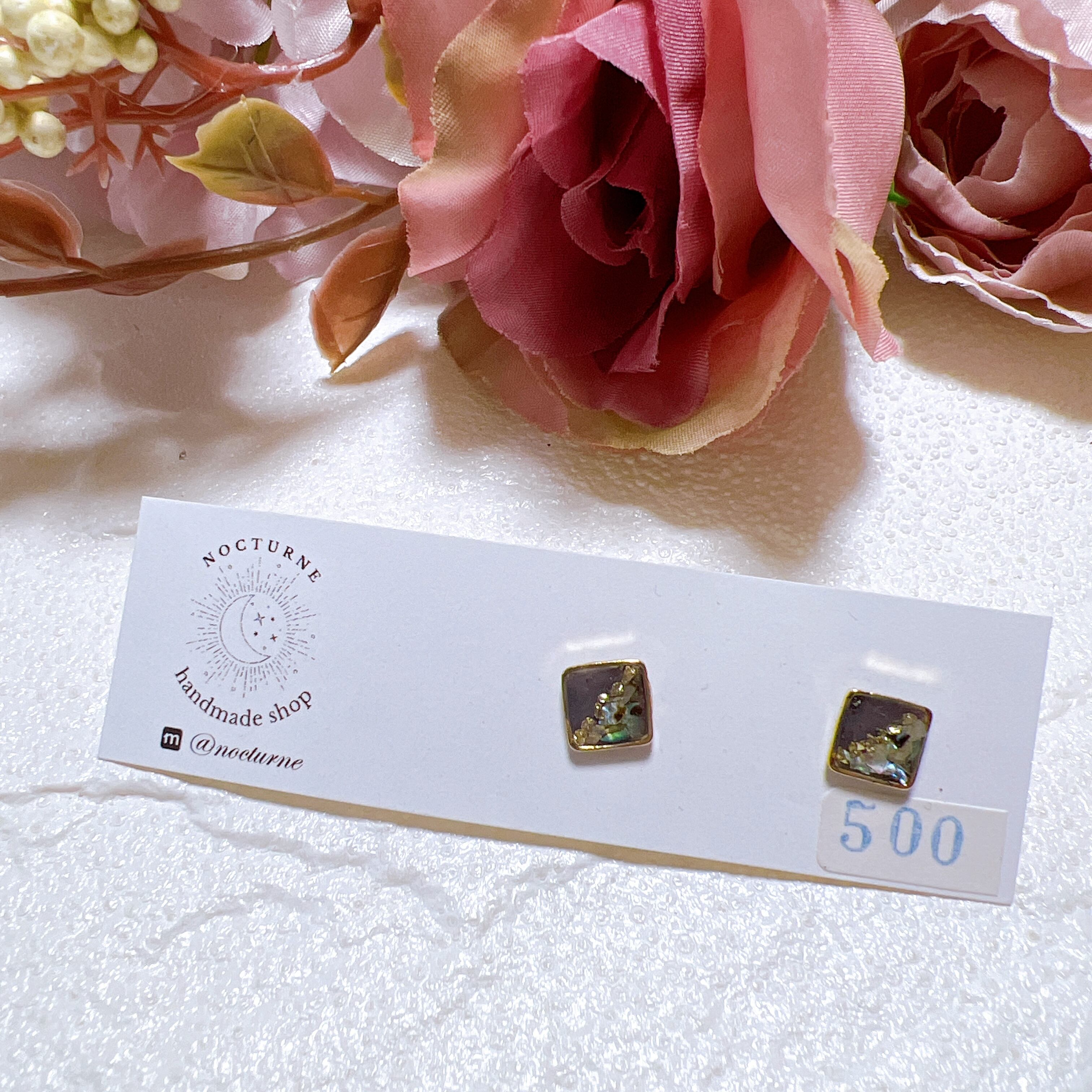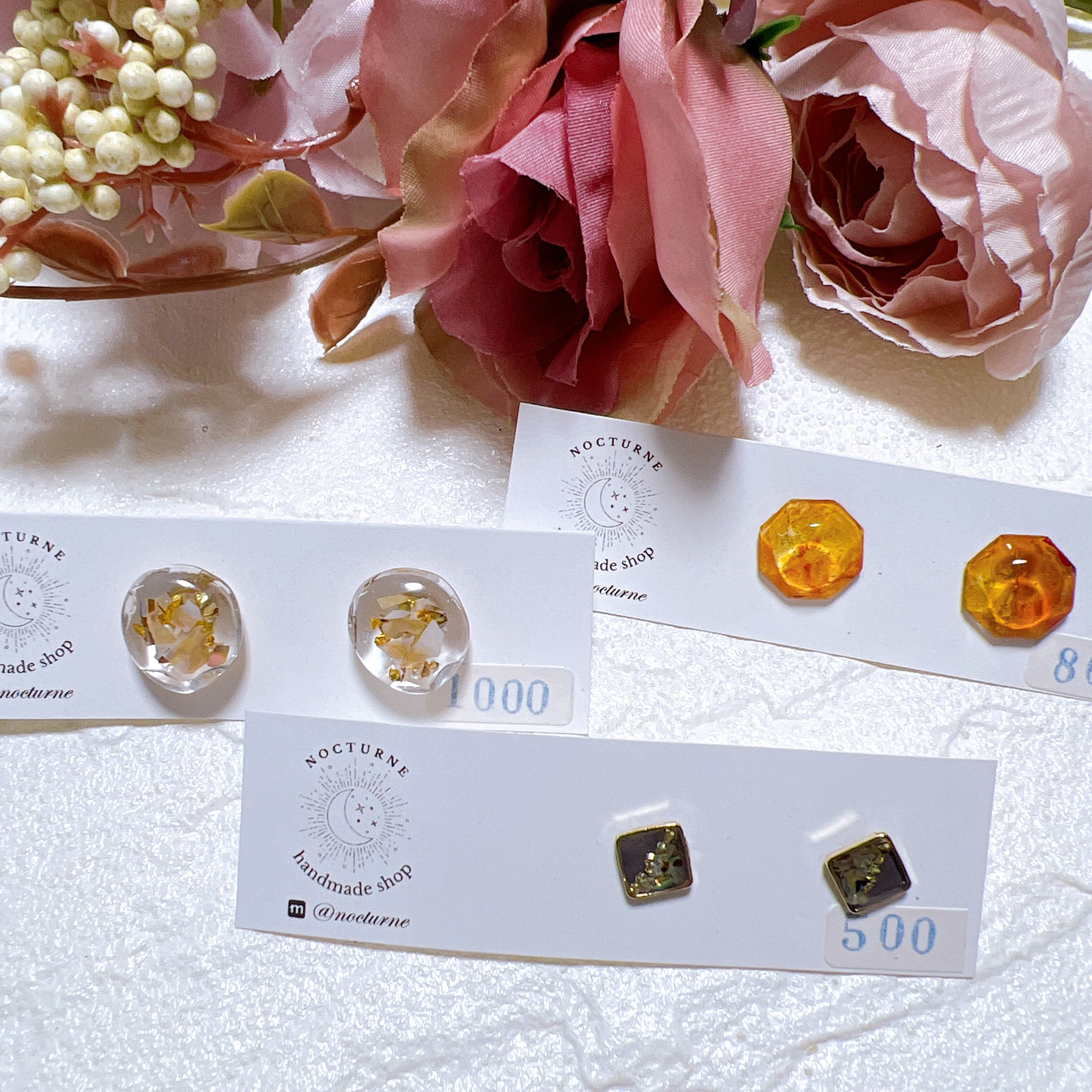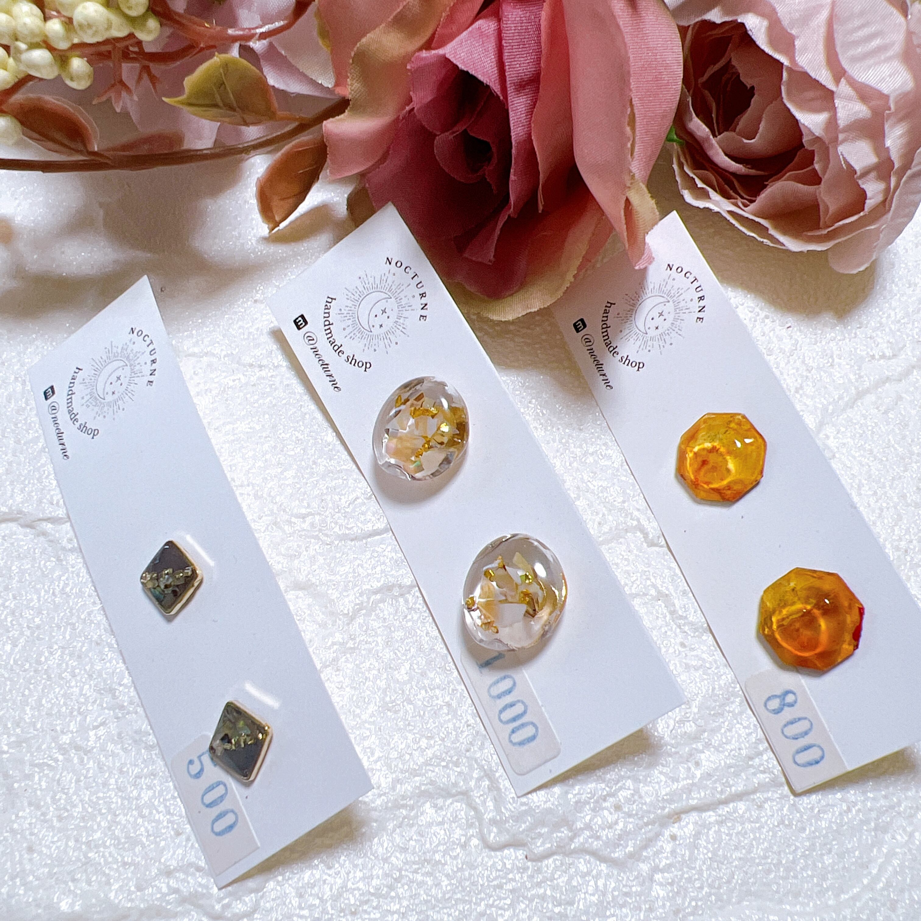 シェルのレジン一粒ピアス、アルコールインクアートのレジンピアス、スクエアレジンピアスの3点です。
