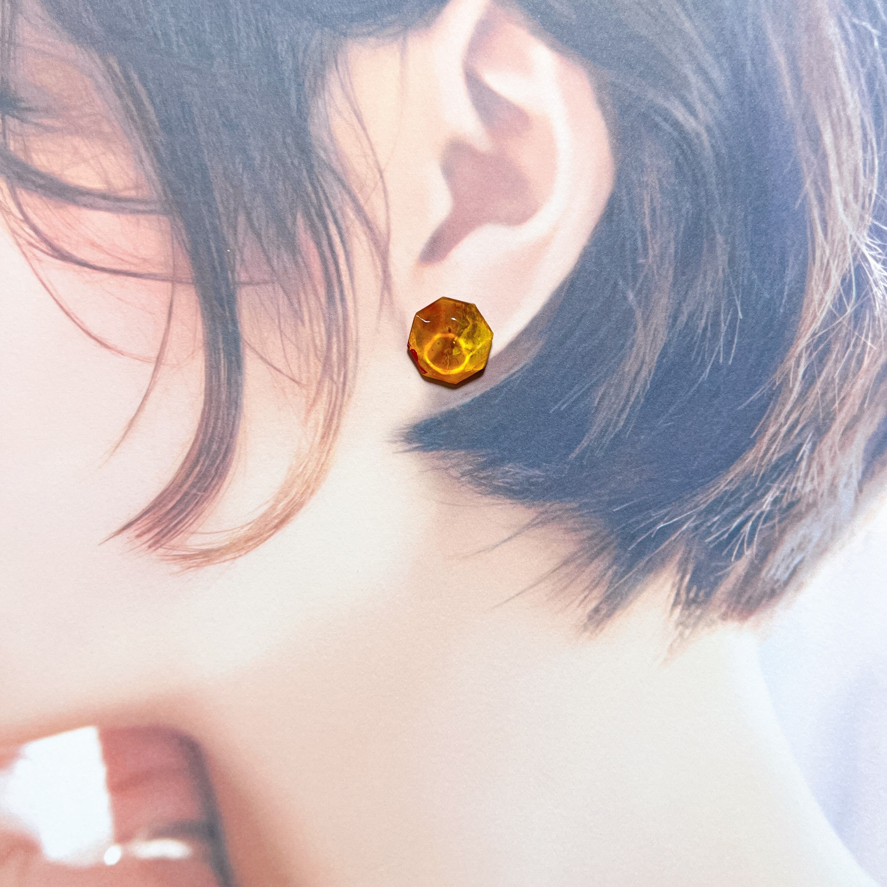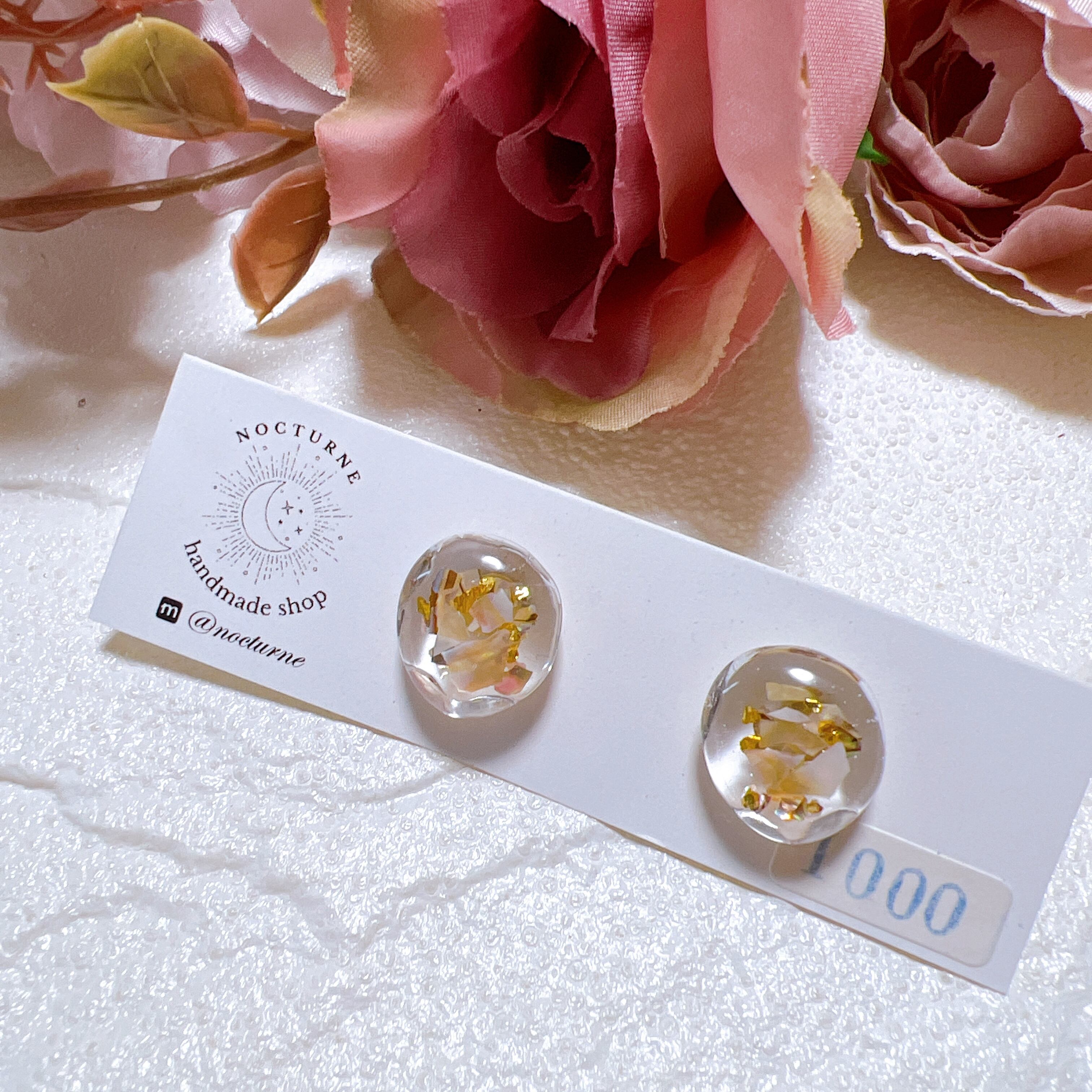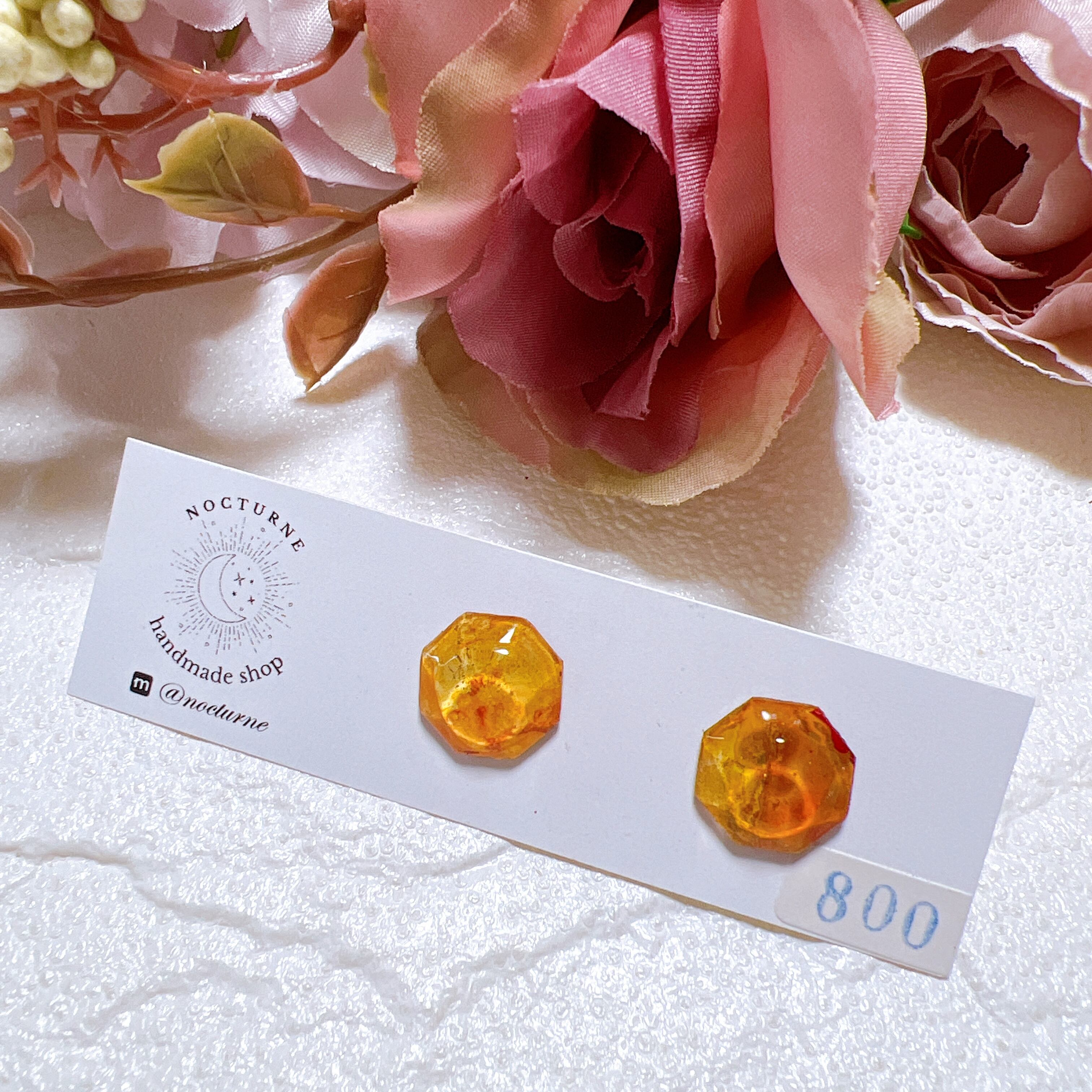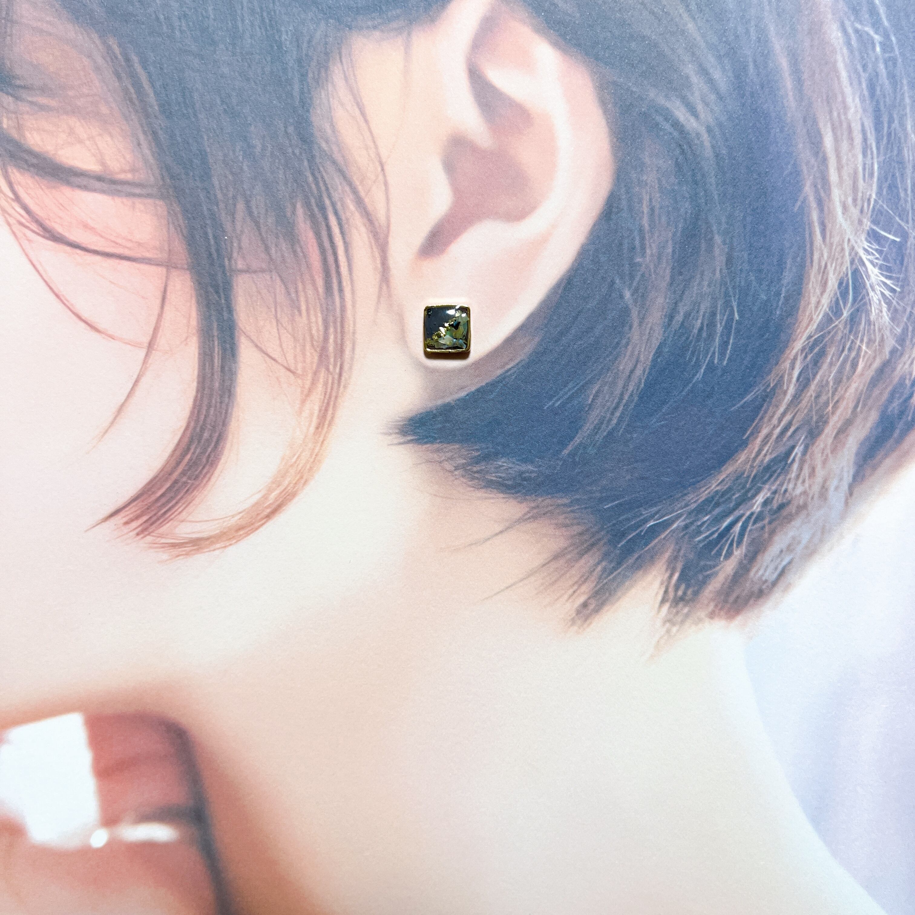 シェルのレジン一粒ピアス、アルコールインクアートのレジンピアス、スクエアレジンピアスの3点です。