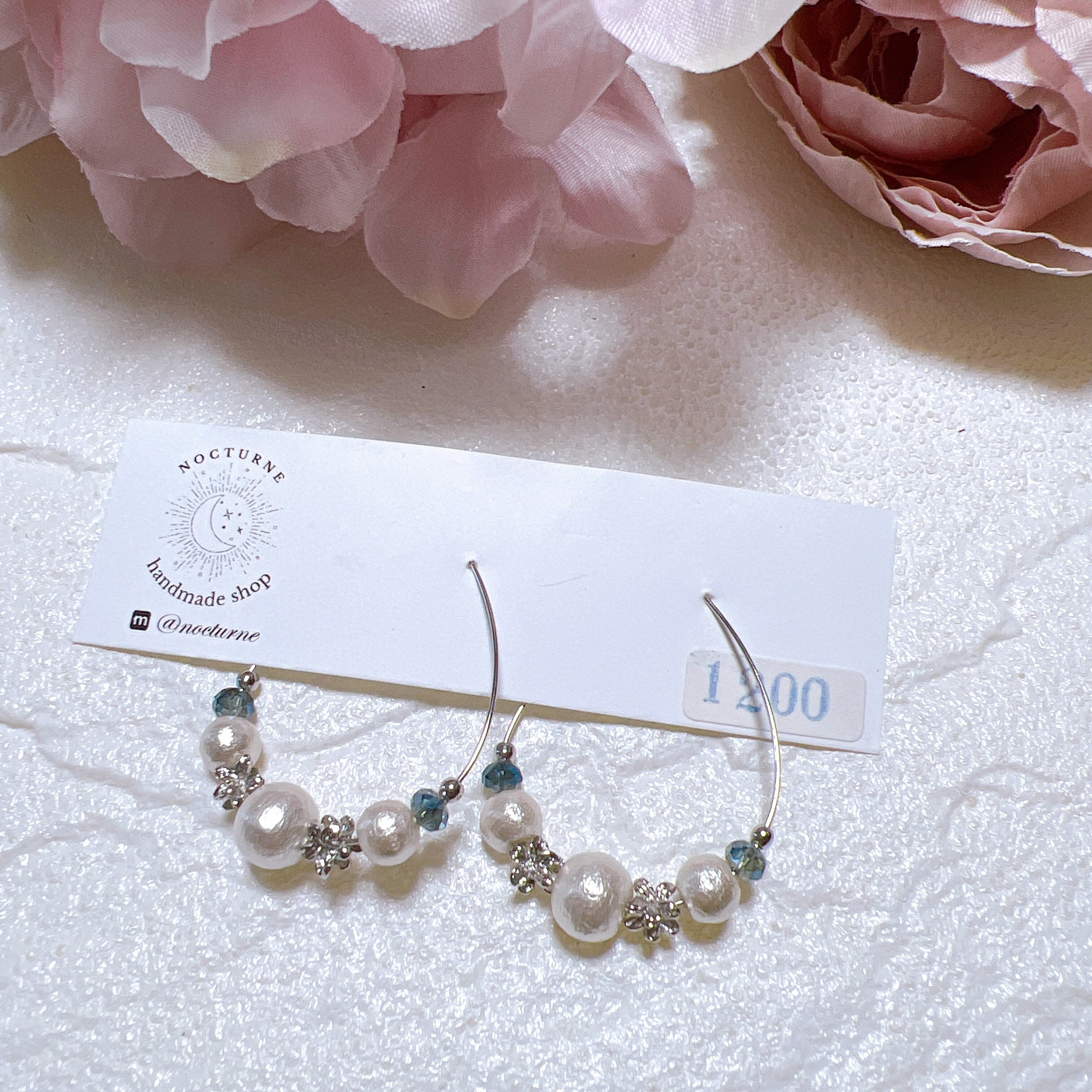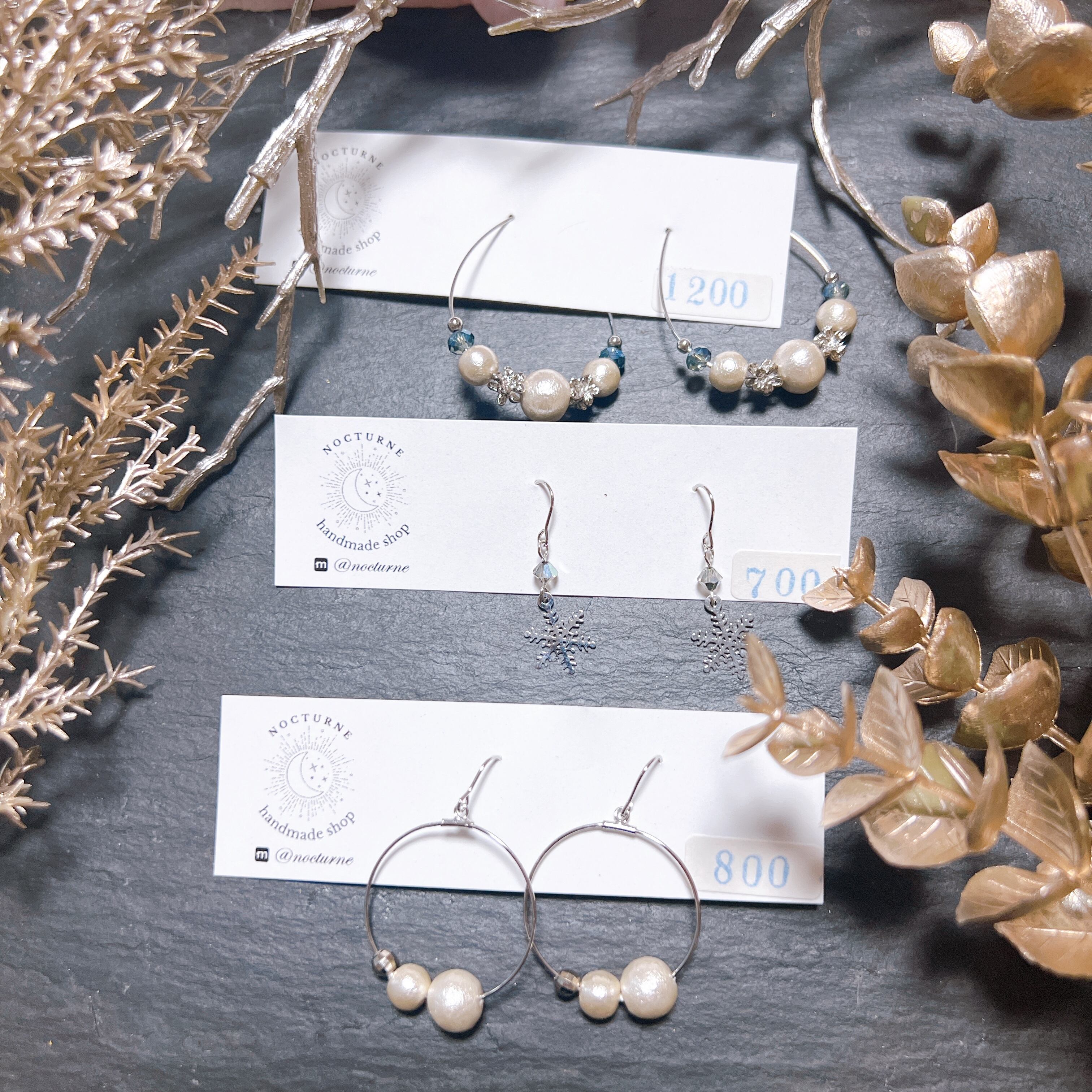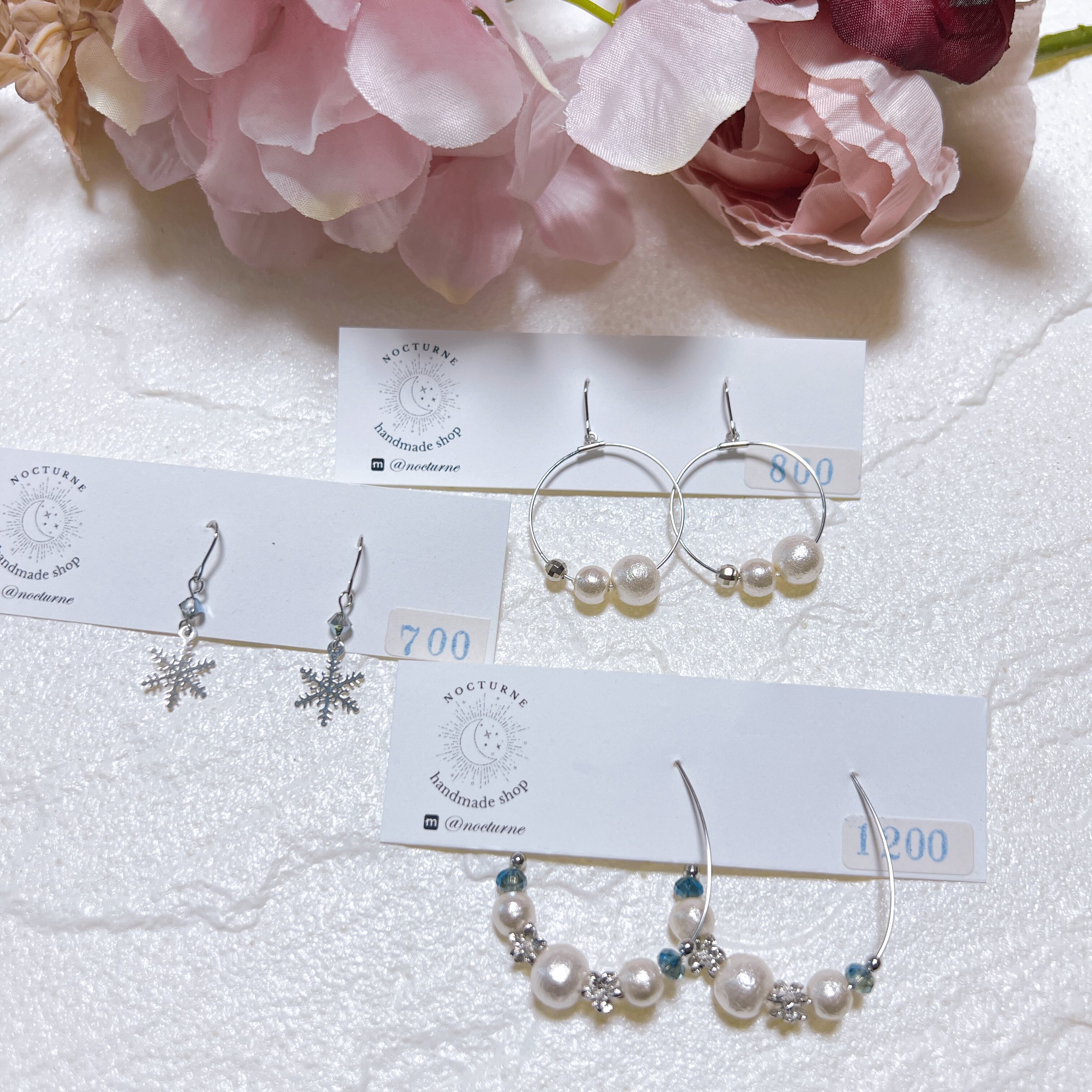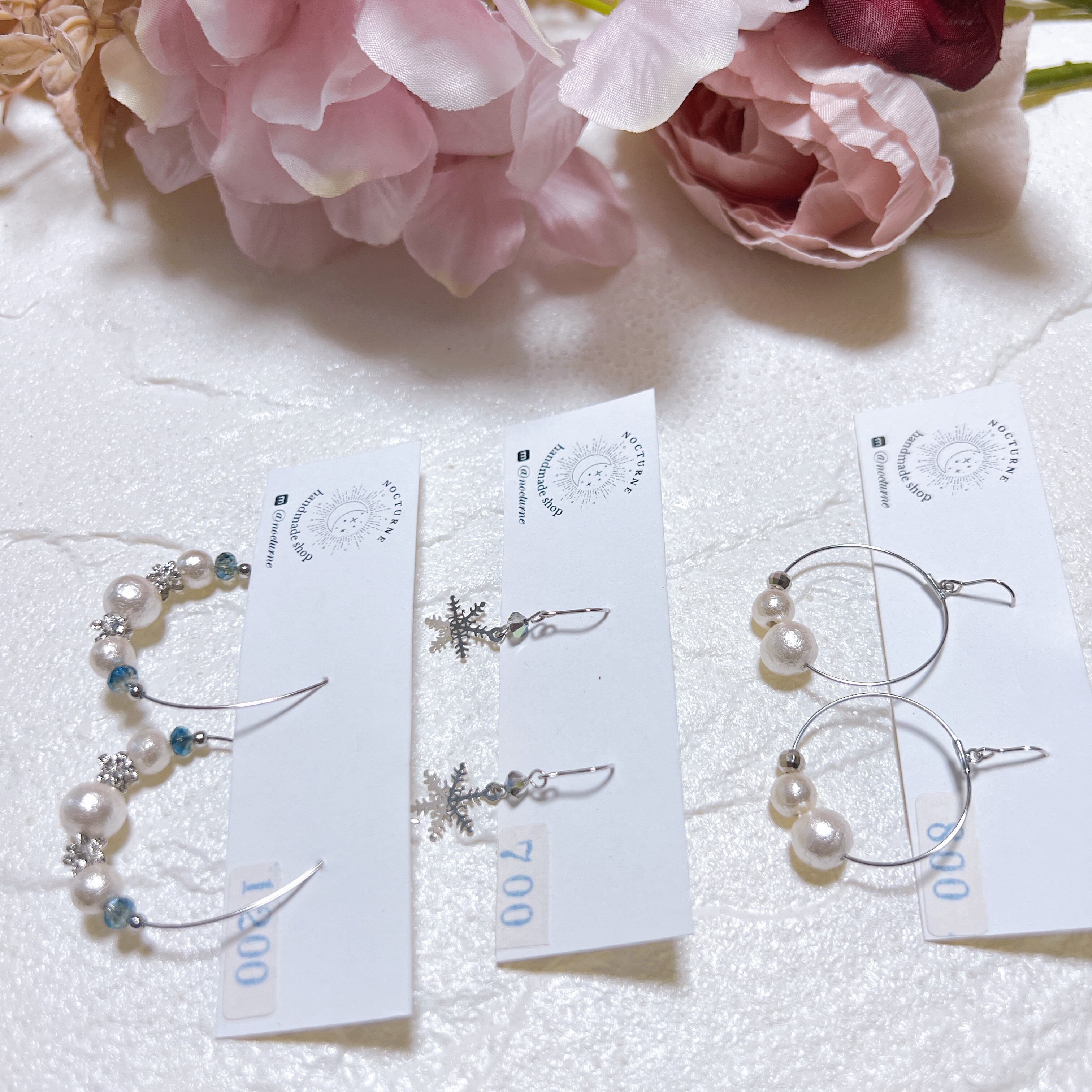 コットンパールのフープピアス2点と雪の結晶のピアスになります。