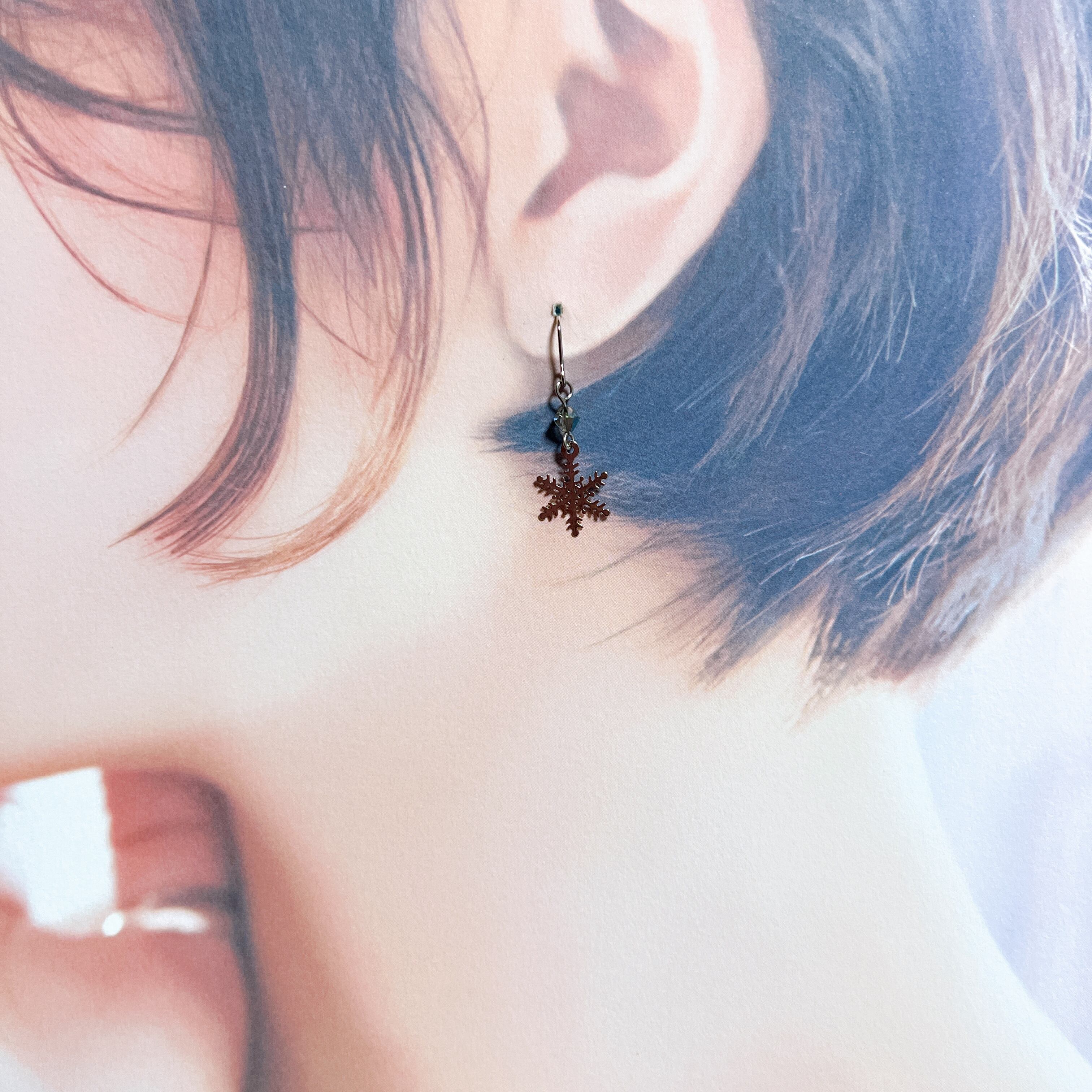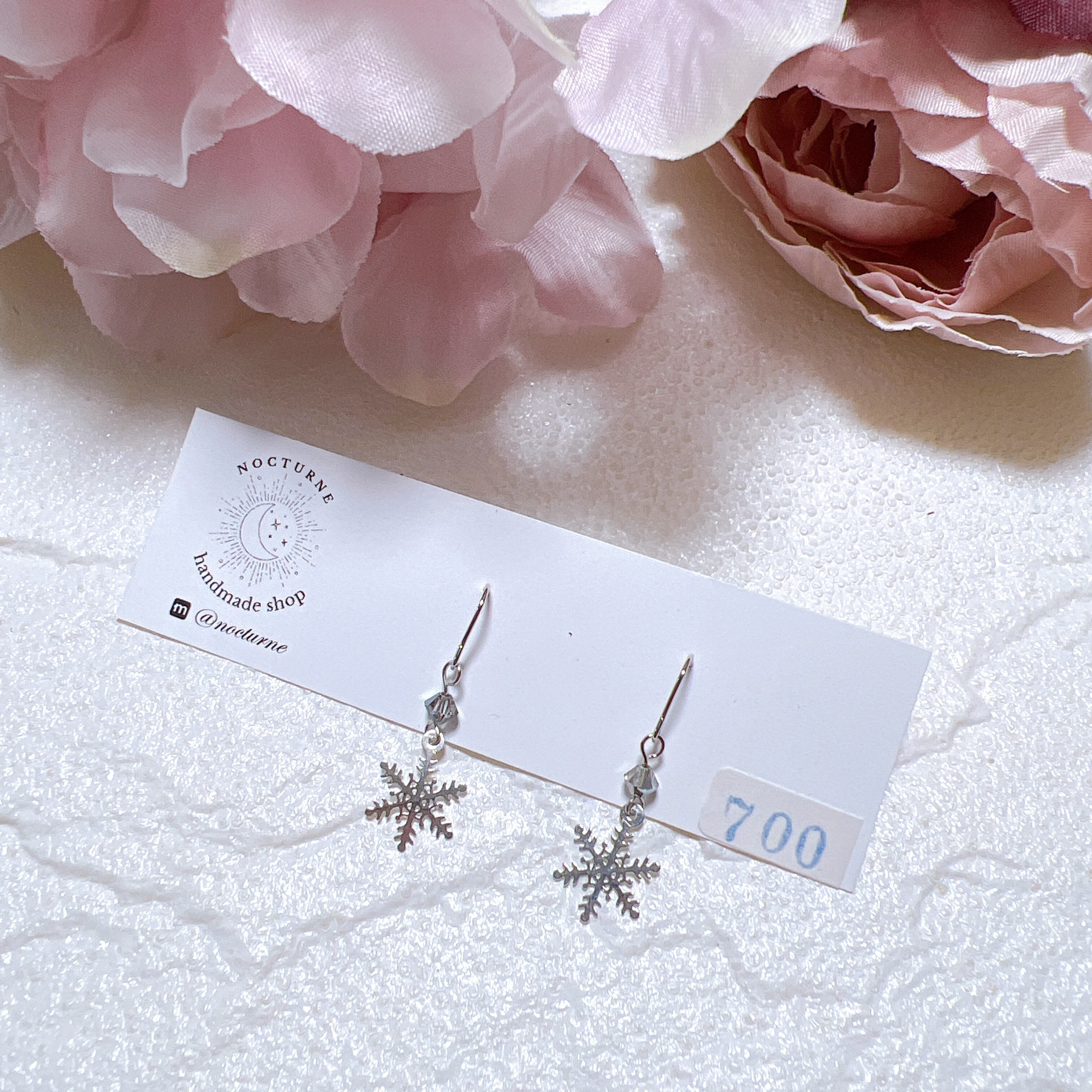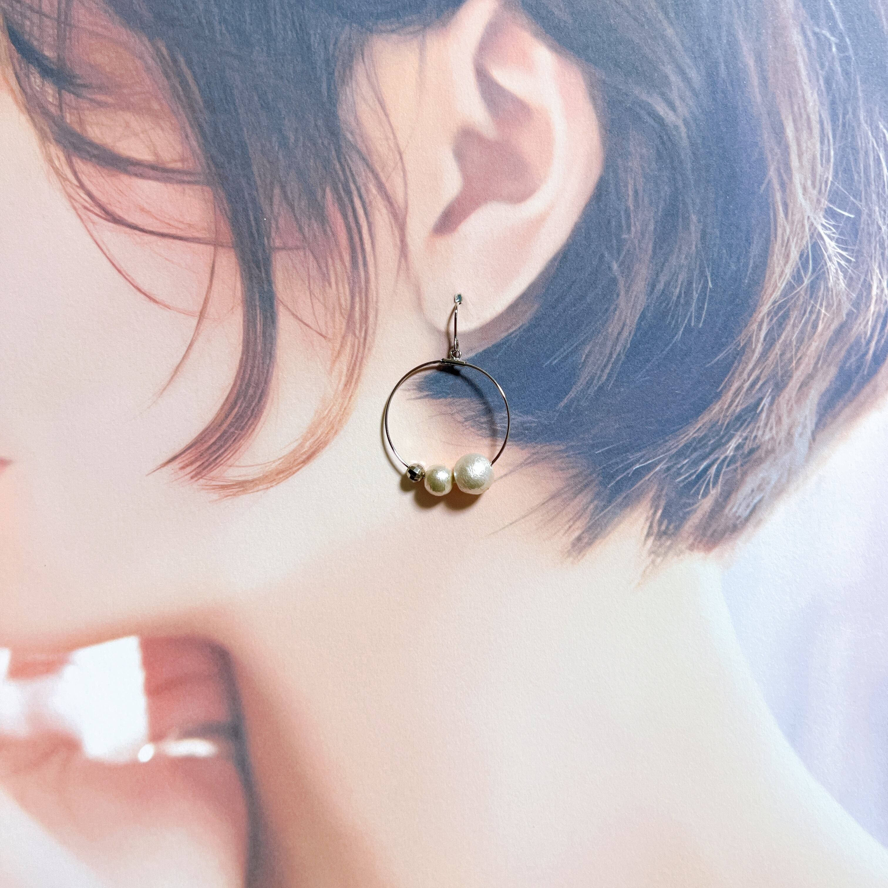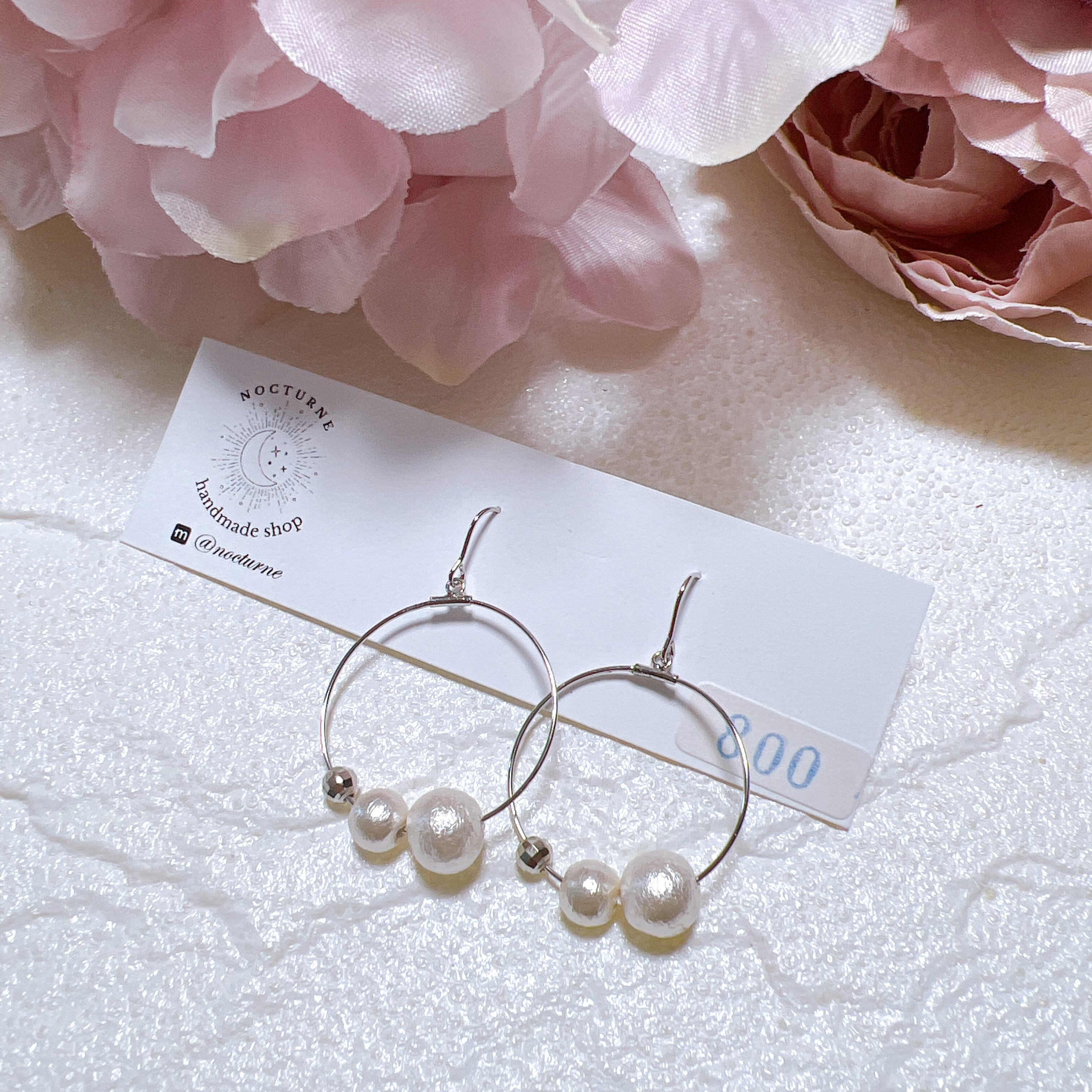 コットンパールのフープピアス2点と雪の結晶のピアスになります。