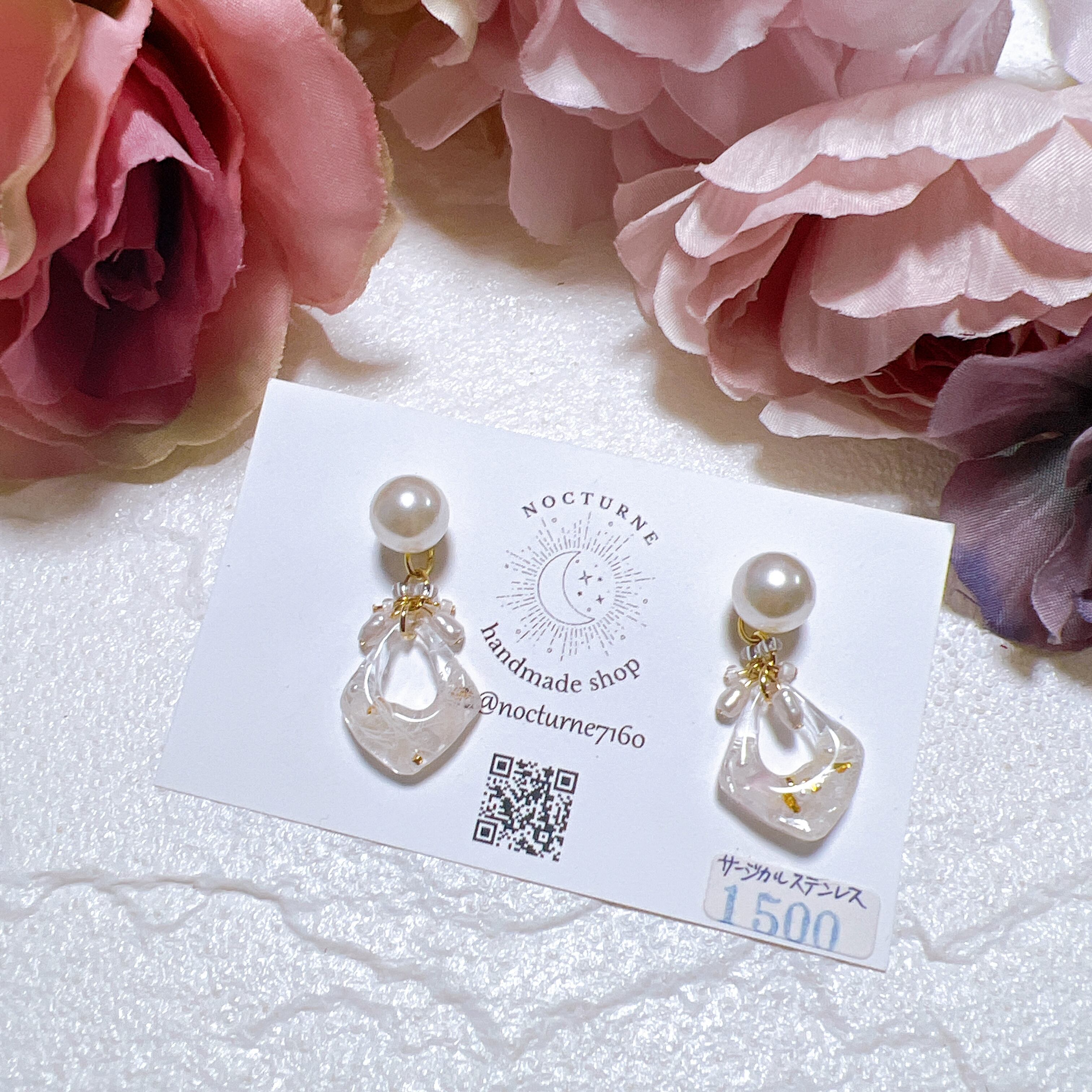 パールとドライフラワーのレジンピアスはパーツが付け外しできるようになっています。